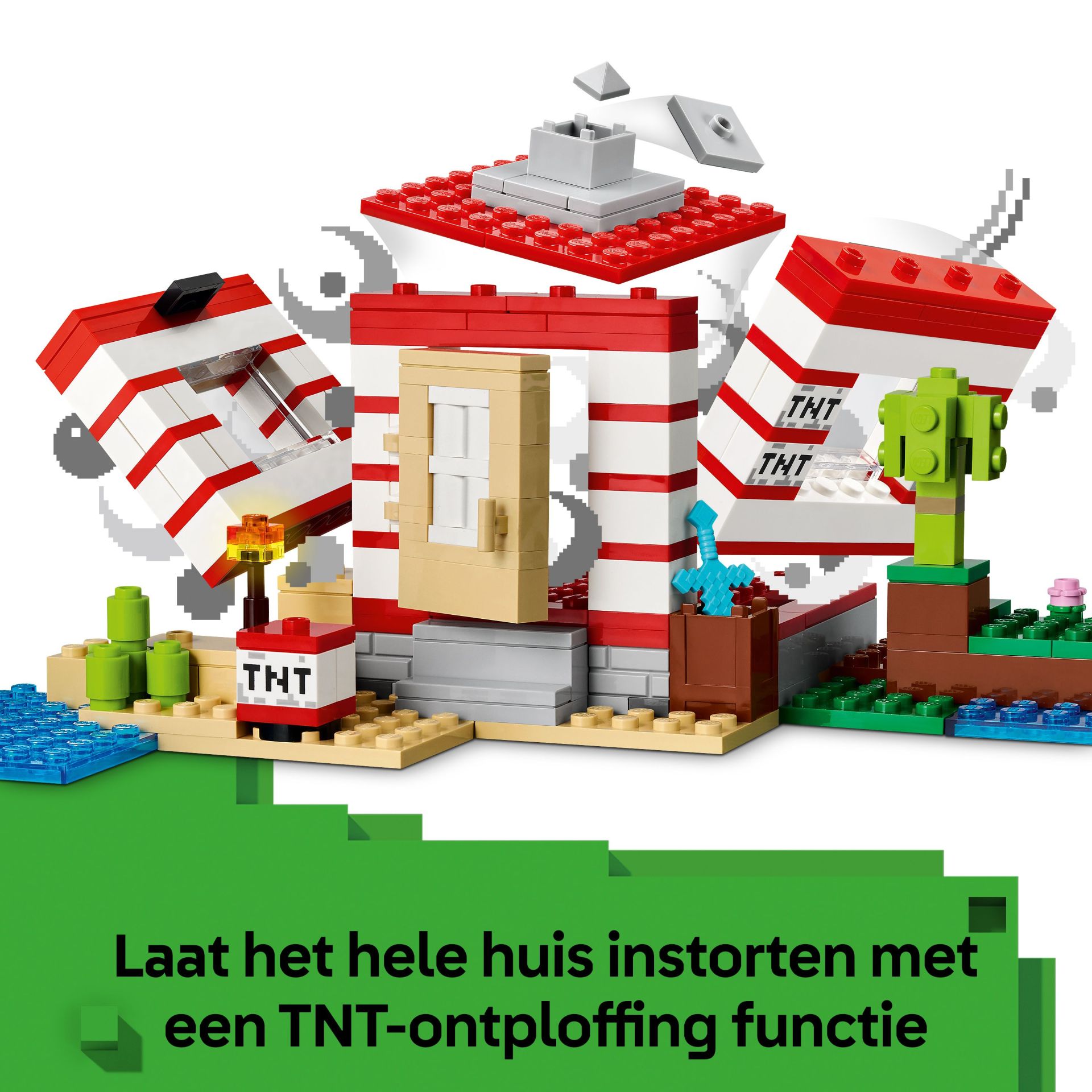 Explosief LEGO® Minecraft® avonturenspeelgoed – kinderen kunnen met een schakelaar een explosiefunctie activeren die het plafond en de muren van het huis laat instorten