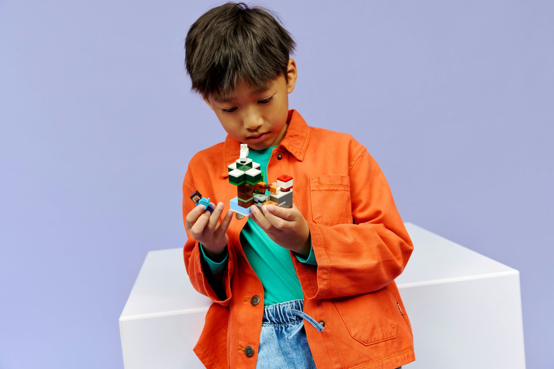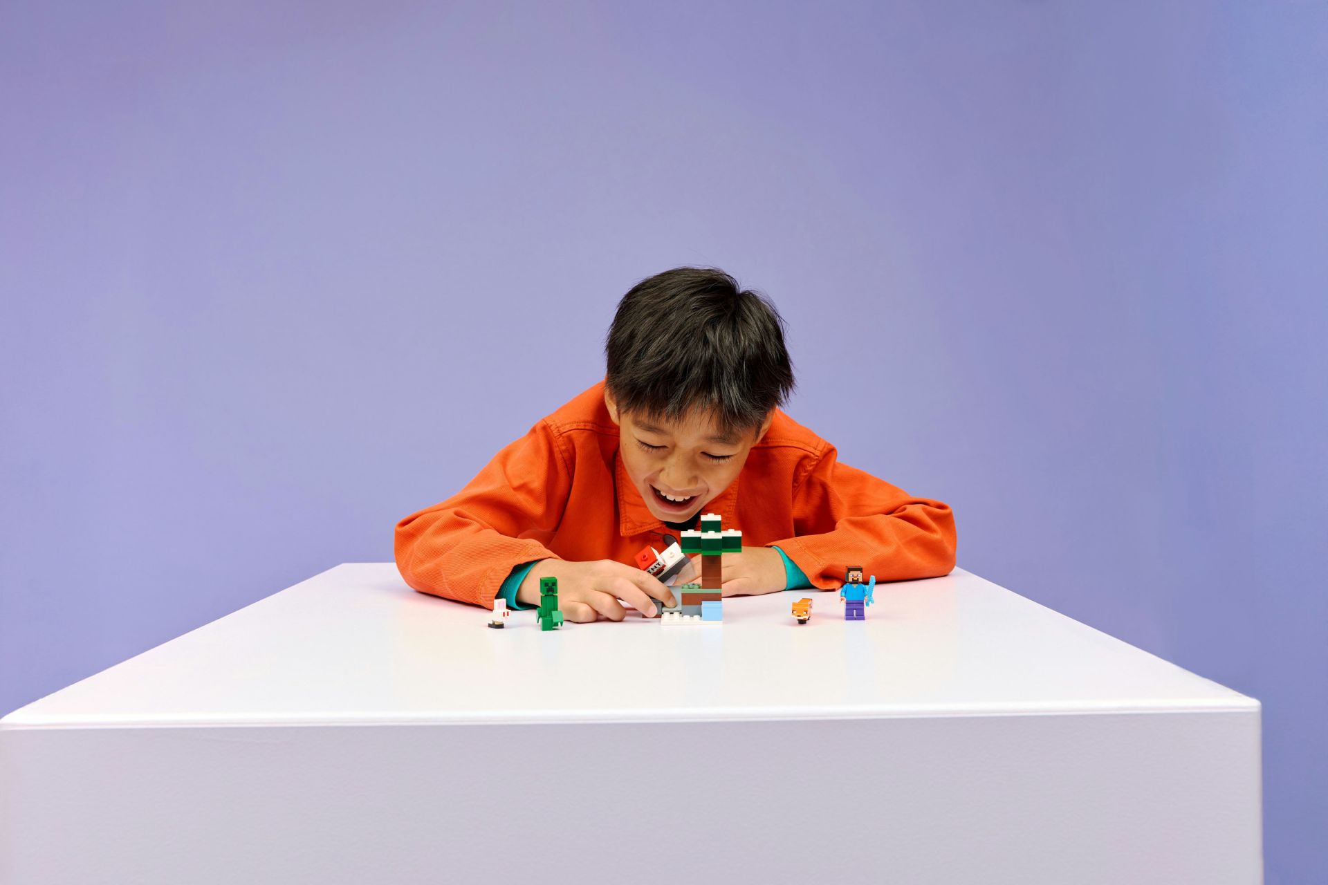 4 LEGO® MINECRAFT® PERSONAGES – bouw avonturen in het Taiga-bioom met een Steve minifiguur, een Creeper™ en 2 Minecraft dierenfiguren van een vos en een konijntje