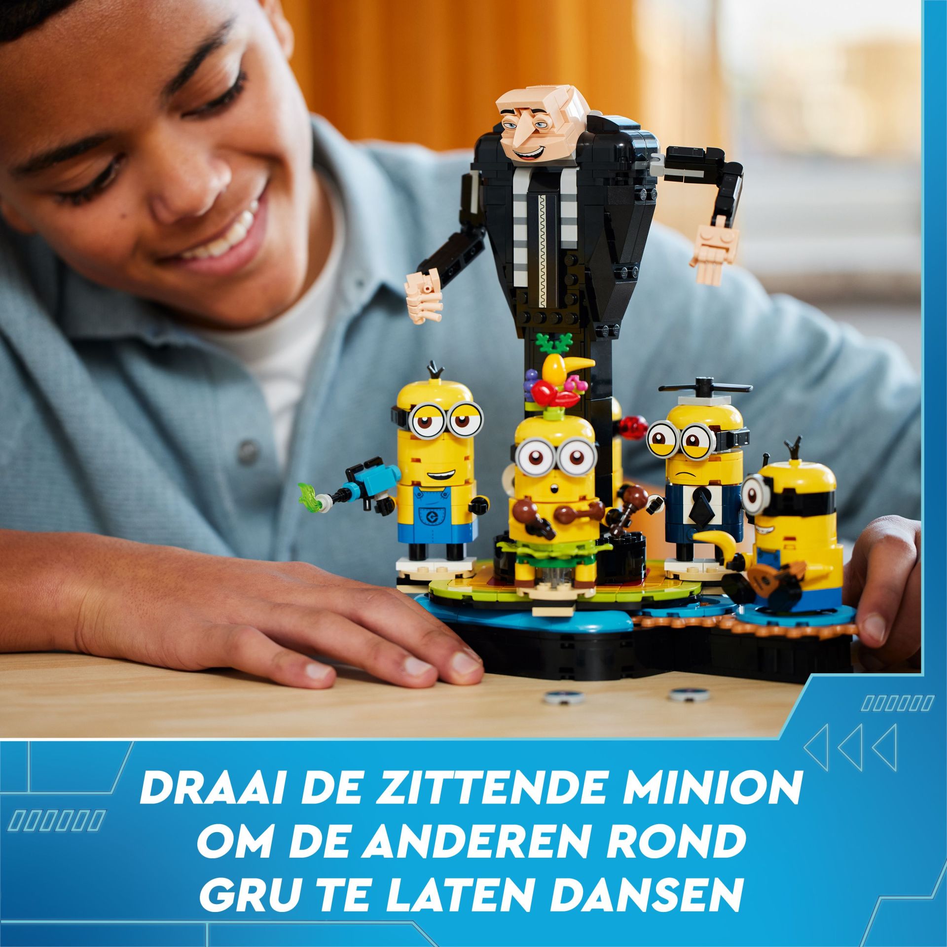 Speel in op de passie van een kind voor Minions speelgoed met LEGO Verschrikkelijke ikke 4 Bouwbare Gru en Minions (75582). Dit bouwpakket voor kinderen van 9 jaar en ouder bestaat uit een bouwbare Gru figuur omringd door dansende Minions en is een geweldig cadeau voor Minons fans. De grote figuur van Gru heeft beweegbare armen, handen en vingers. Er zijn 5 bouwbare Minions personages: Jerry met sambaballen en een fruithoed, geheim agent Dave met een propeller en walkietalkie, Beedoo Minion met een megafoon, de ukelele spelende Mel en Kevin met zijn scheetkanon. De Minions worden op een draaiend platform geplaatst en wanneer kinderen aan de zittende Minion draaien, dansen de andere Minions rond hun baas! Elke Minion kan de handen bewegen en accessoires vasthouden. Hun hoofden kunnen bewegen en de ogen kunnen worden veranderd om verschillende uitdrukkingen te creëren. Kinderen kunnen 4 Minions van de standaard halen voor extra speelmogelijkheden. Deze set is een mooi verjaardagscadeau voor kinderen die van de Minions films en rollenspellen houden. Afmetingen: deze set is ca. 28 cm hoog, 23 cm breed en 16 cm diep. Bevat 839 onderdelen.