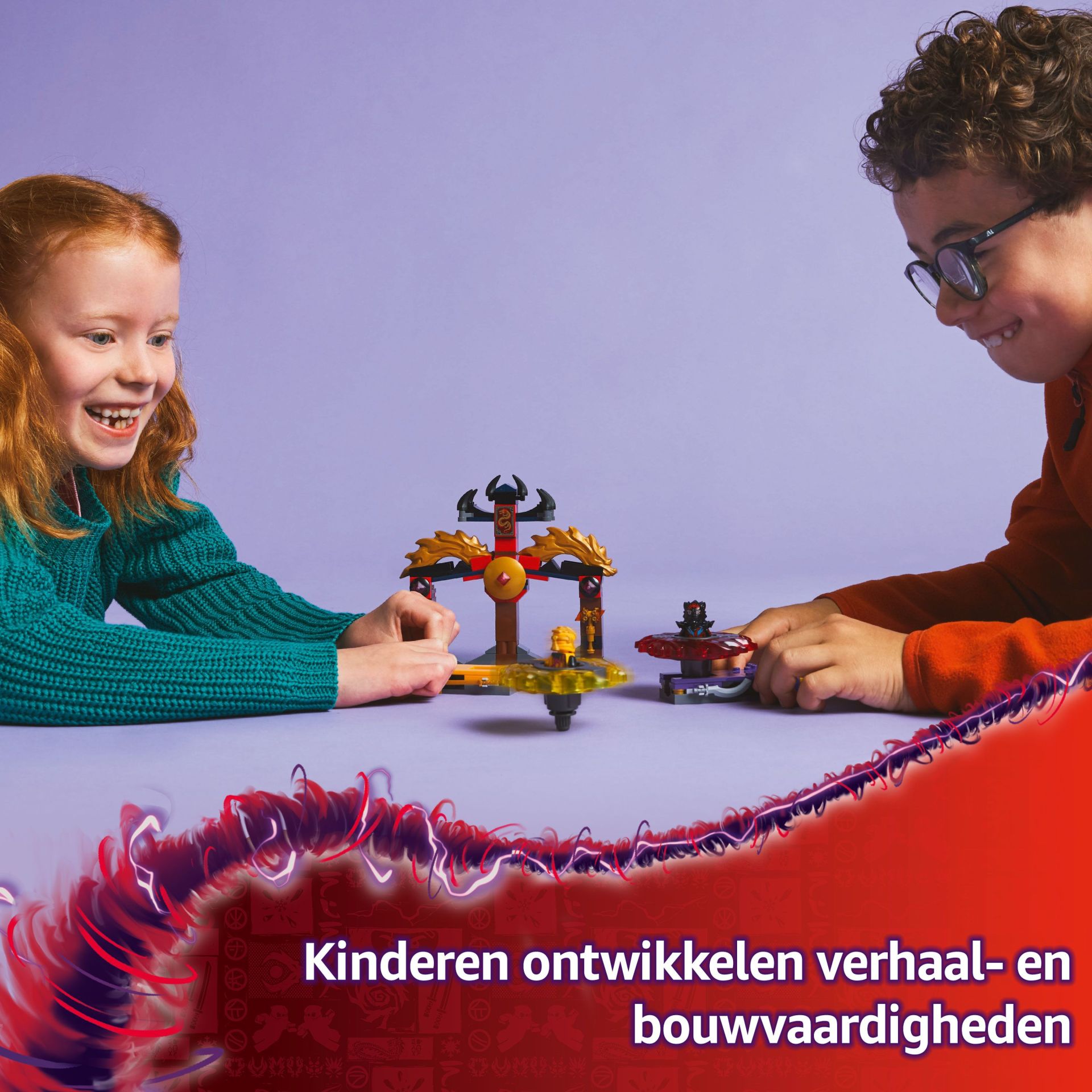 Kinderen kunnen geweldige avonturen beleven waarin ze duels tussen goed en kwaad naspelen met de gele spinner van Arin en de rode spinner van Ras, beide met afneembare krachtelementen. De NINJAGO personages kunnen hun spinners upgraden met gouden elementen, die ze kunnen winnen door de arena te raken en in te laten storten.