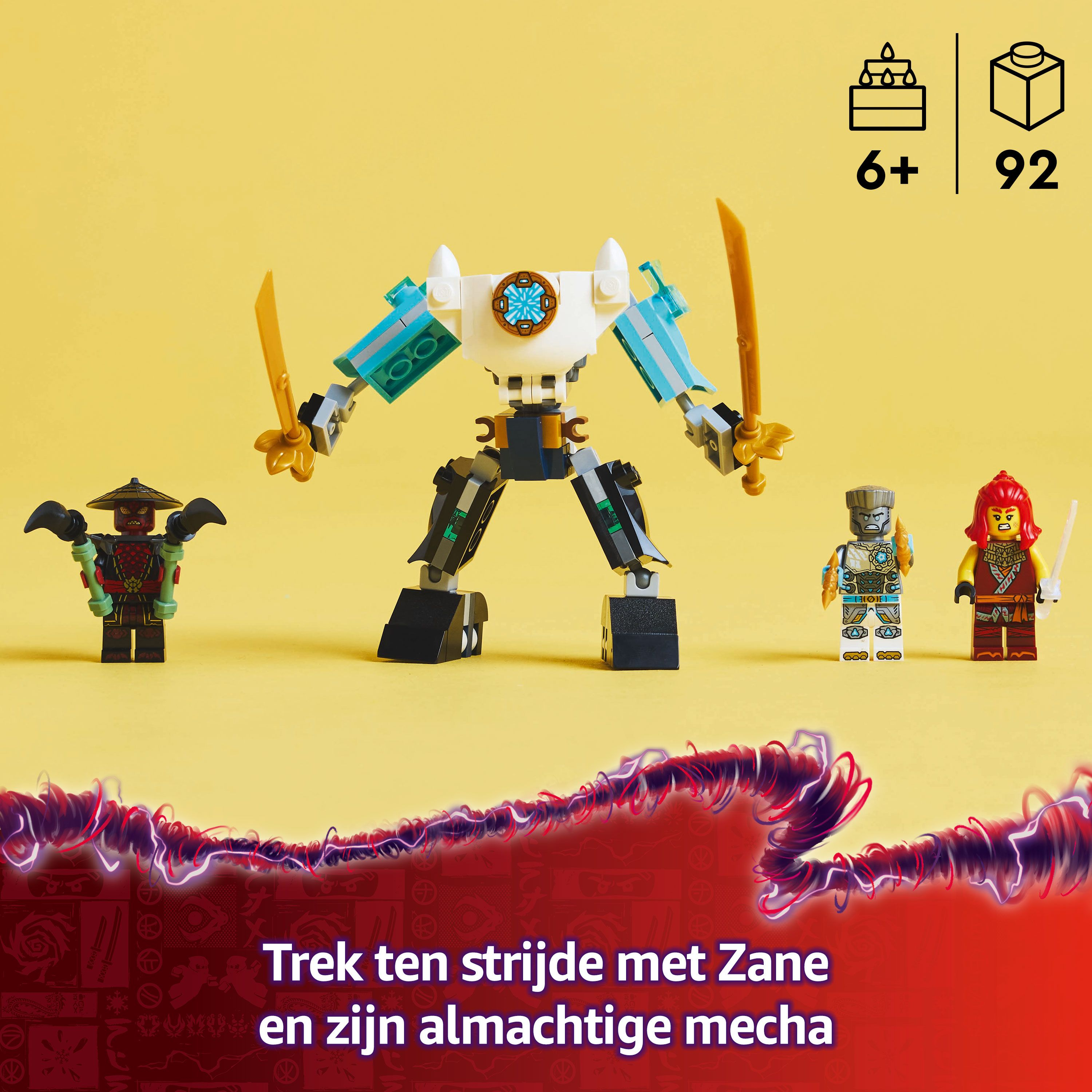 Afmetingen – deze 92-delige LEGO® NINJAGO® bouwset voor kinderen bevat Zane's strijdmecha, een figuur van ca. 10 cm hoog