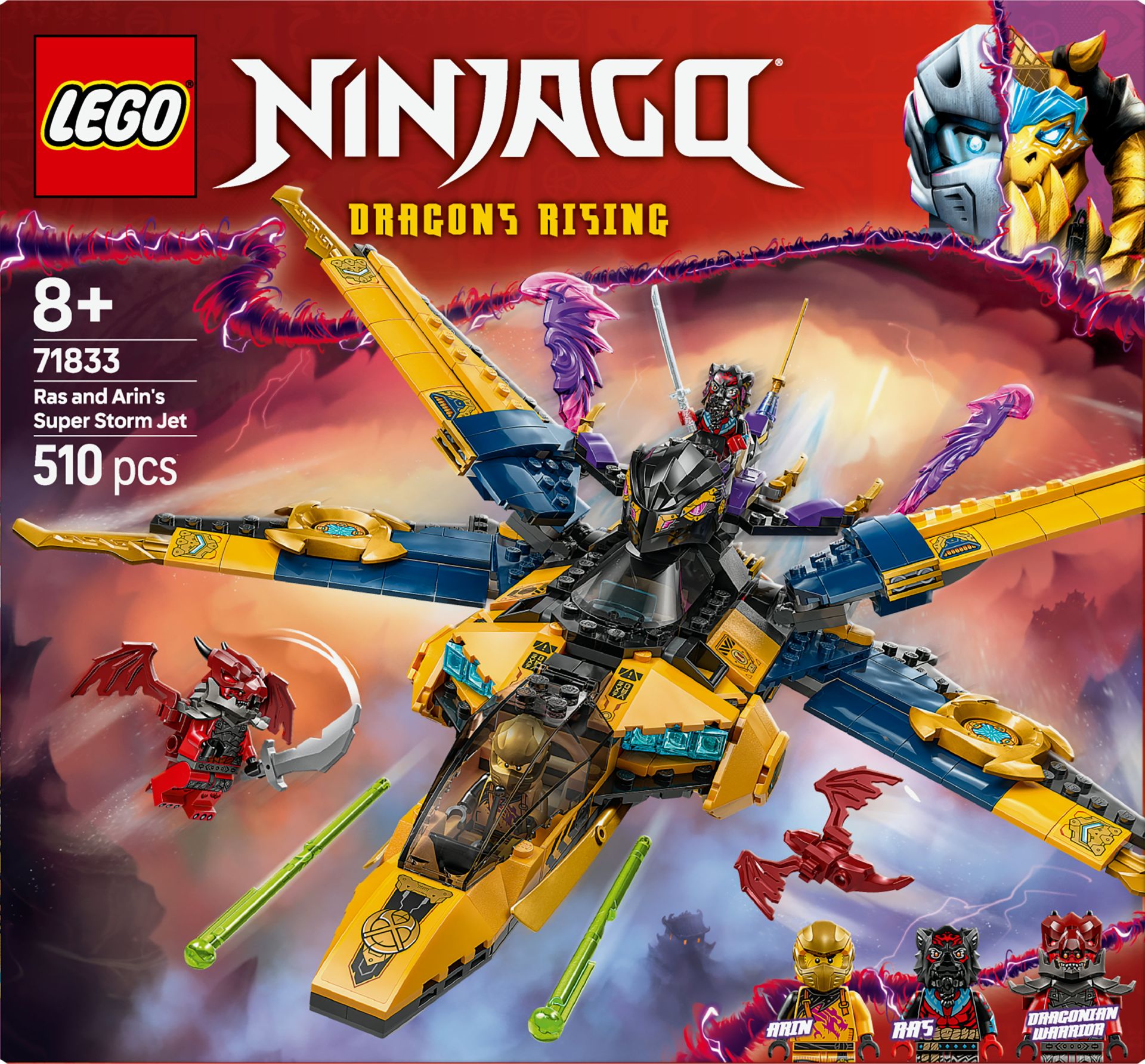 Jongens en meisjes vanaf 8 jaar kunnen scènes uit seizoen 3 van de tv-serie NINJAGO® De Drakenstrijd naspelen met Ras en Arins superstormvliegtuig (71833). Deze LEGO® bouwset bestaat uit een cool speelgoedvliegtuig met een afneembare drone en een ontsnappingscapsule, plus minifiguren van Arin, Ras en een Draconische strijder en een minimodel van een draak voor urenlange rollenspellen.