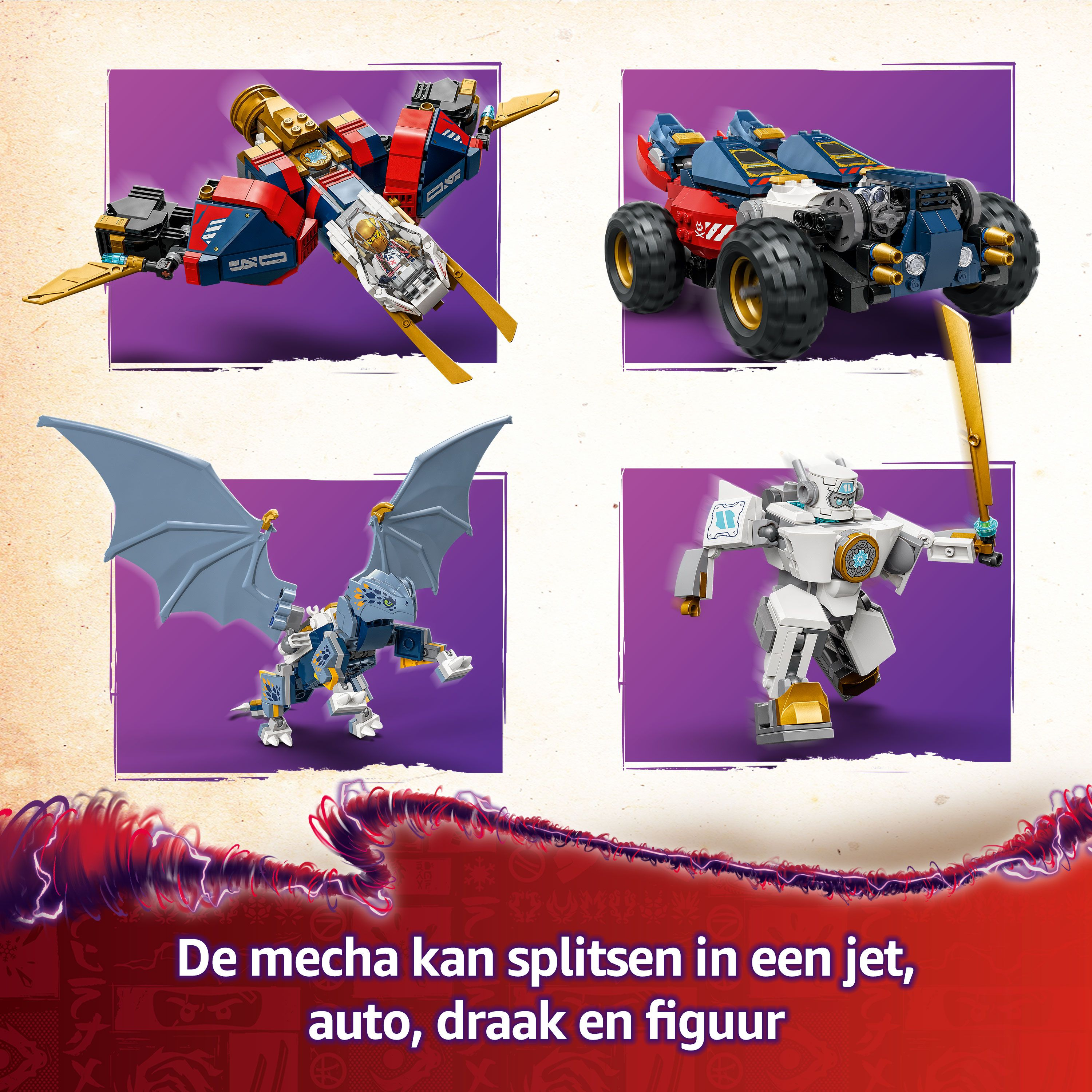 Afneembare ninjamodellen – Zane's ultra-combomecha kan worden opgesplitst in 4 kleinere modellen: een speelgoed vliegtuig, een LEGO auto, een actiefiguur en een speelgoed draak