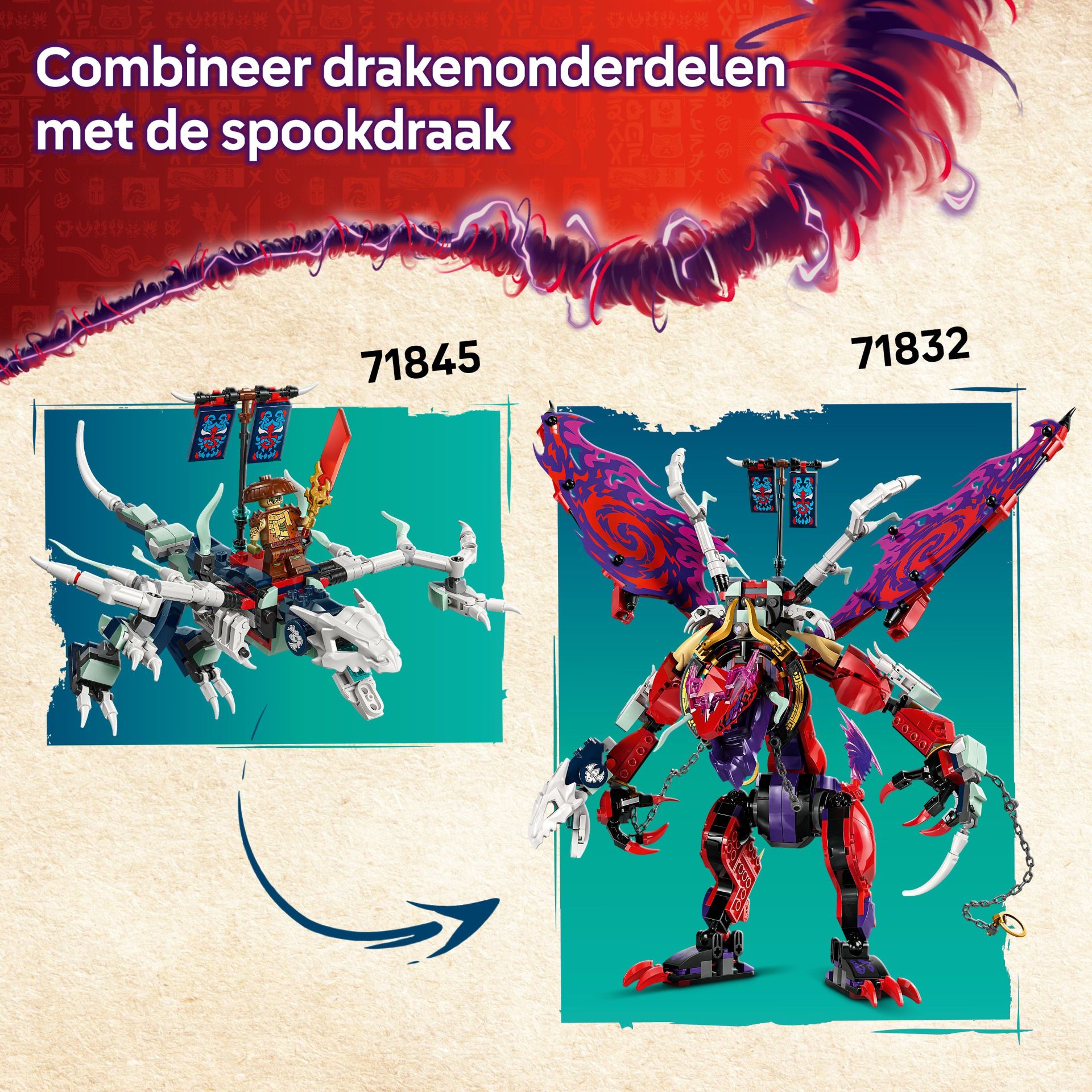 De set bevat 5 minifiguren: Sora en Lloyd met ninjawapens en het gemene trio Kur, Tyr en een Draconische geeststrijder, die een banier hebben met een geheime boodschap die alleen kan worden gelezen met behulp van Lloyds doorschijnende onthullingszwaard. Sora heeft een vliegende motor, terwijl de schurken een verstelbare spookdraak hebben die kan worden gecombineerd met onderdelen van de Bliksemtand Draak van Chaos (71832) speelset (apart verkrijgbaar). De set bevat 1112 onderdelen.