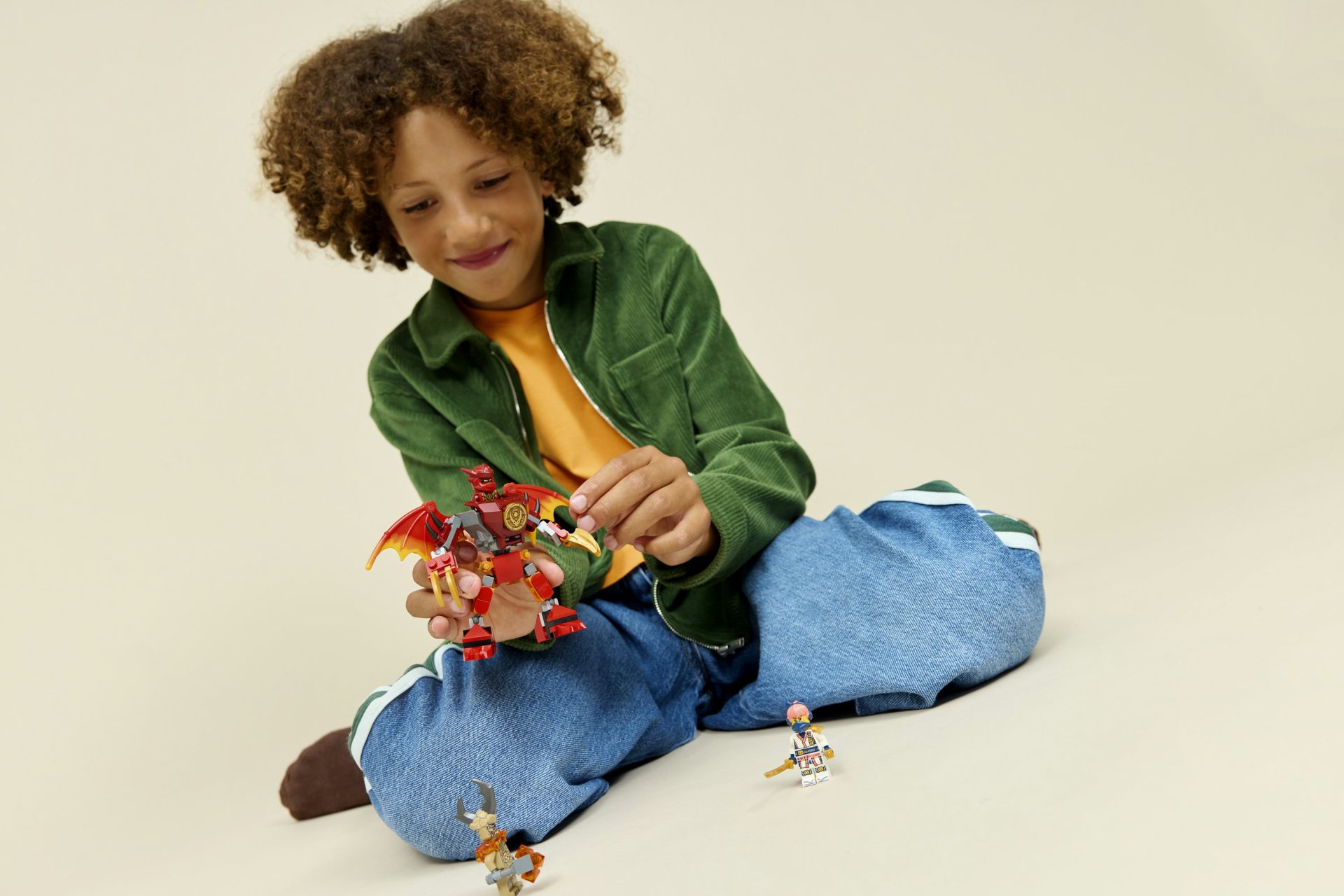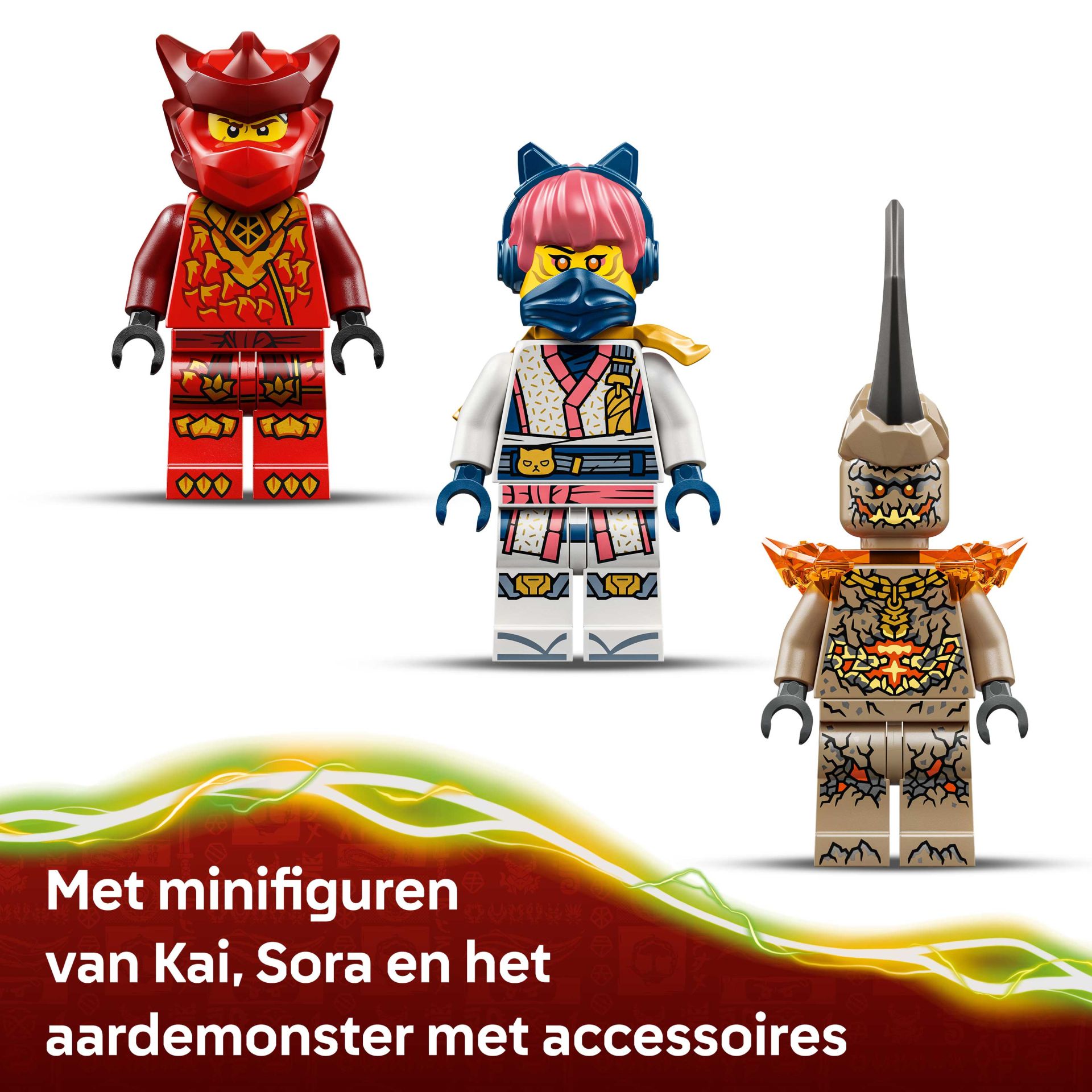 Dit voordelige ninjaspeelgoed wordt ook geleverd met 3 minifiguren: Kai met 2 zwaardaccessoires, Sora met 2 zwaarden en een aardemonster met klauwen, waarmee kinderen urenlang kunnen genieten van avonturen terwijl ze scènes uit seizoen 4 van de tv-serie NINJAGO® De Drakenstrijd naspelen.