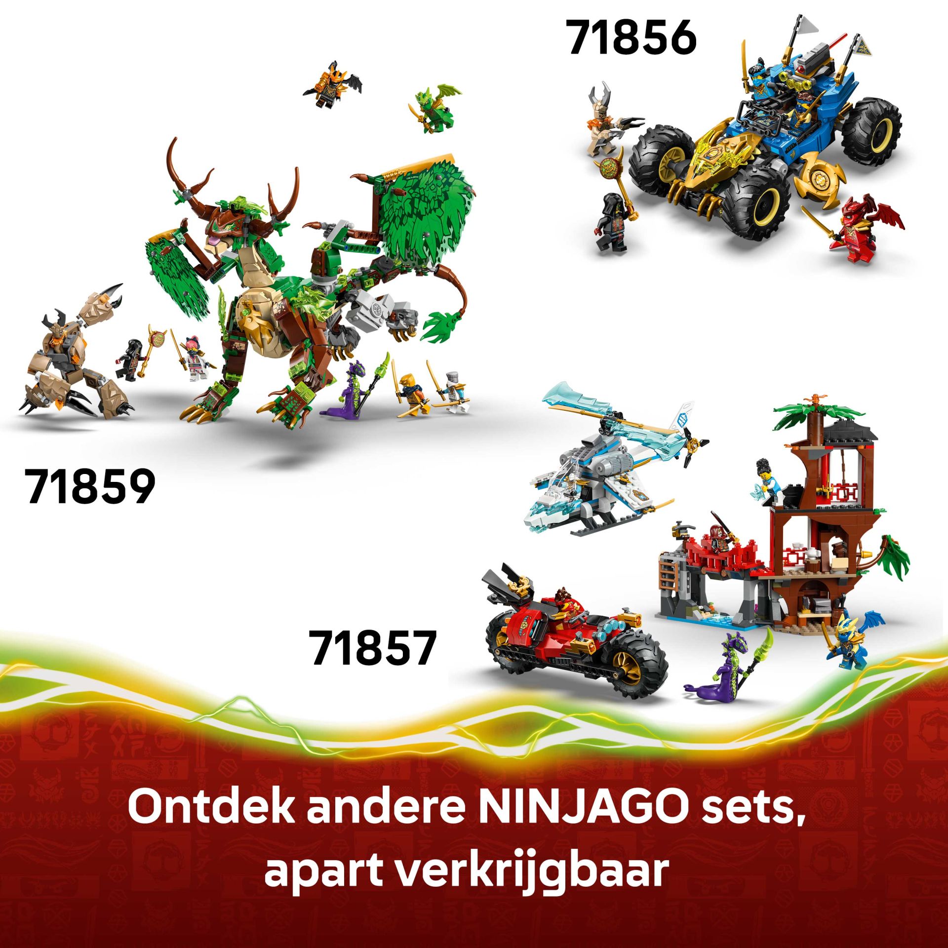 MEER NINJA-AVONTUREN – ontdek ander LEGO NINJAGO speelgoed (sets apart verkrijgbaar) met gedetailleerde mecha, draken, tempels en voertuigen