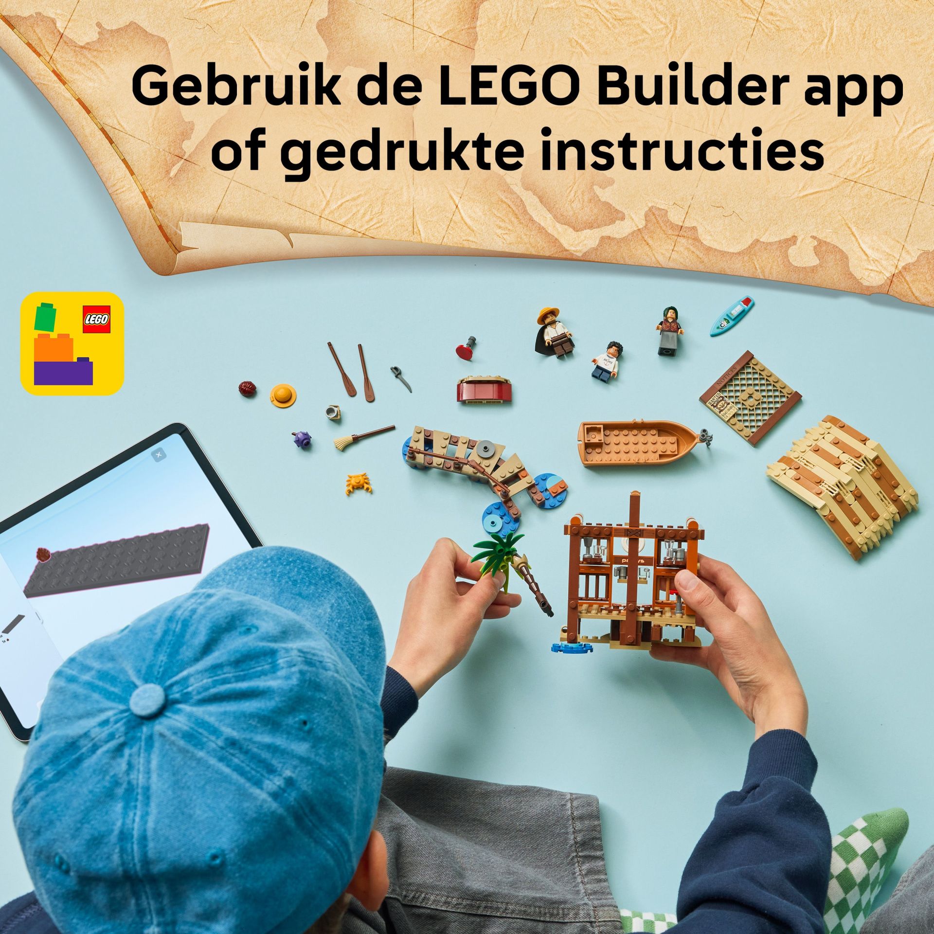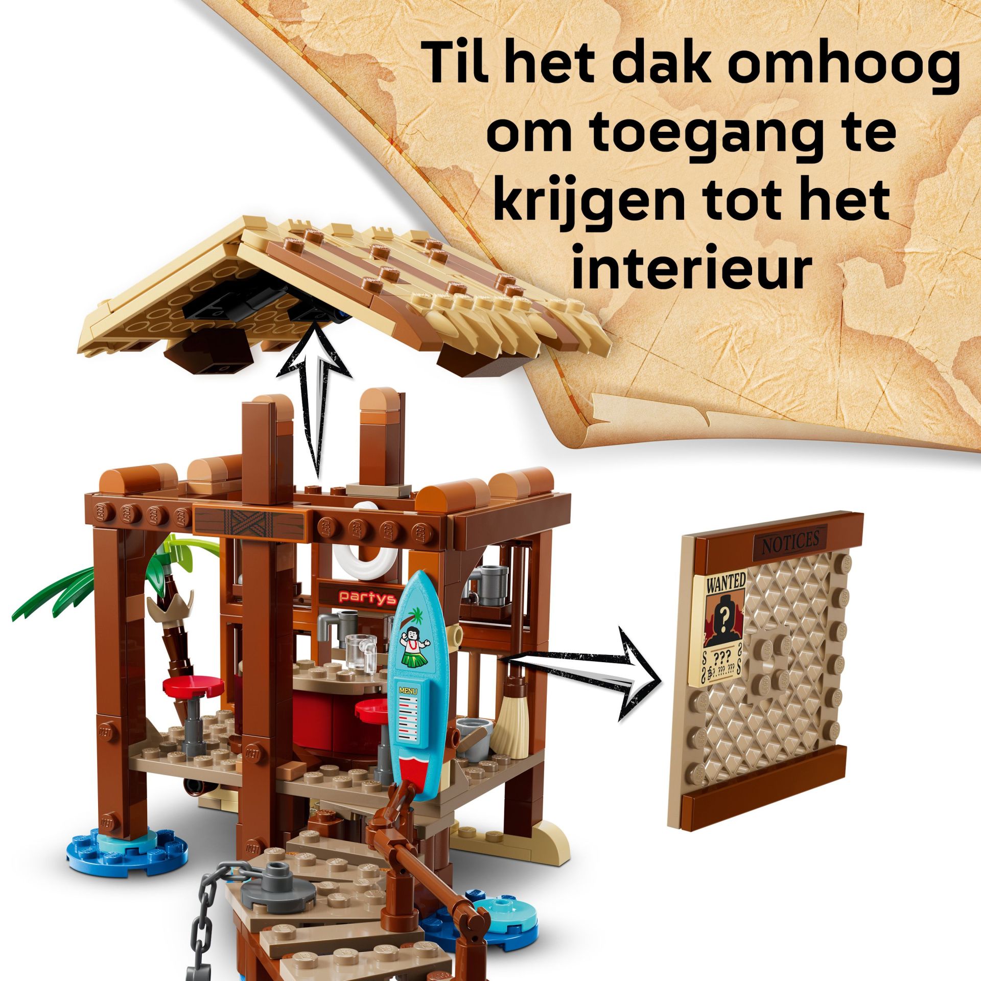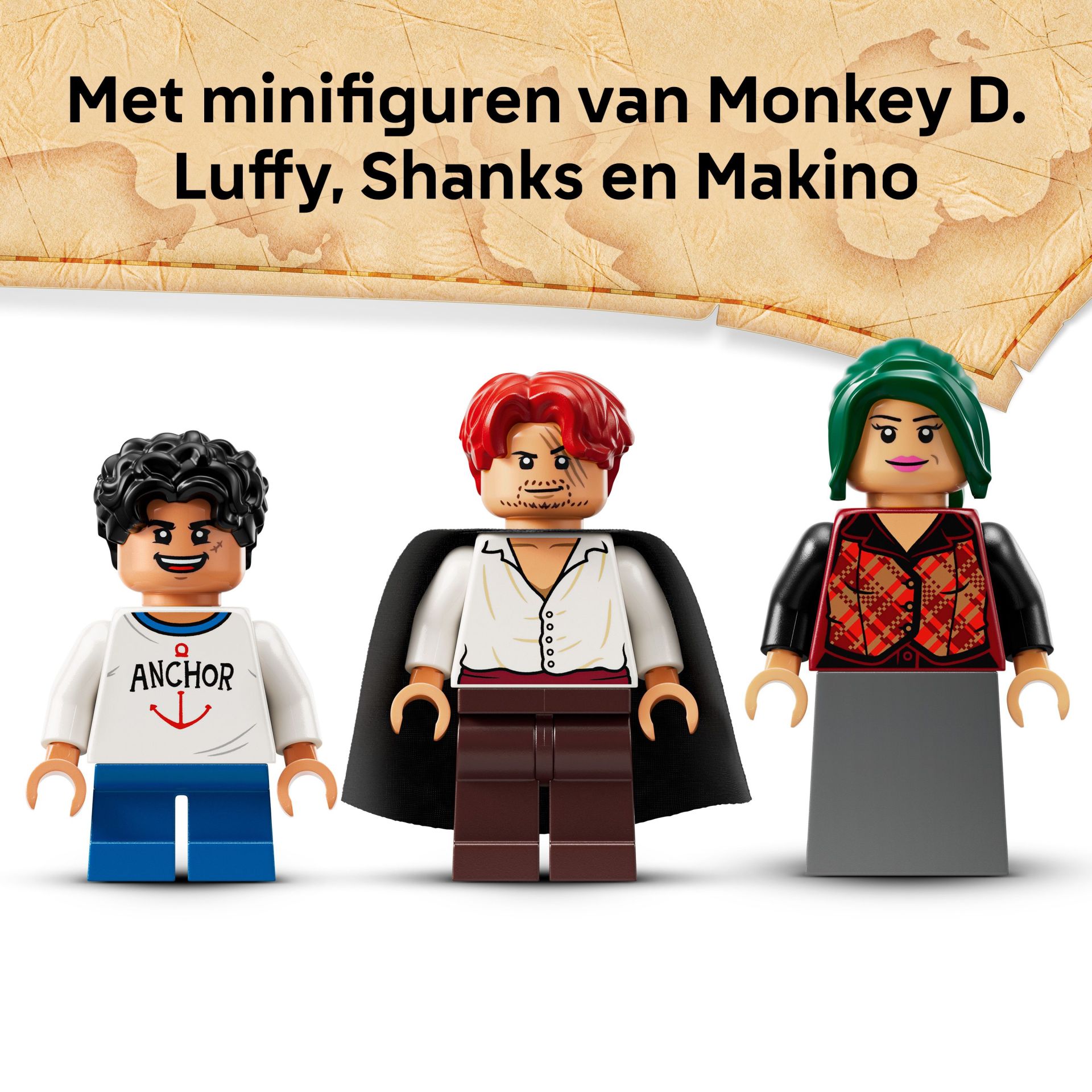Kinderen kunnen het dak van de strandwinkel verwijderen om toegang te krijgen tot de binnenkant. Hier vinden ze accessoires voor de winkel en leuke klanten. Er is een 'Wanted'-poster om aan de muur te bevestigen en ruimte voor extra 'Wanted'-posters uit andere LEGO® ONE PIECE sets (apart verkrijgbaar). Buiten is een piratenboot met een ketting aan de steiger bevestigd. De set bevat minifiguren van Luffy, Shanks en Makino, 3 bekende personages uit de Netflix serie. Voor extra digitaal plezier kunnen bouwers inzoomen, modellen in 3D draaien en hun voortgang bijhouden met behulp van de intuïtieve LEGO Builder app. De set bevat 299 onderdelen.