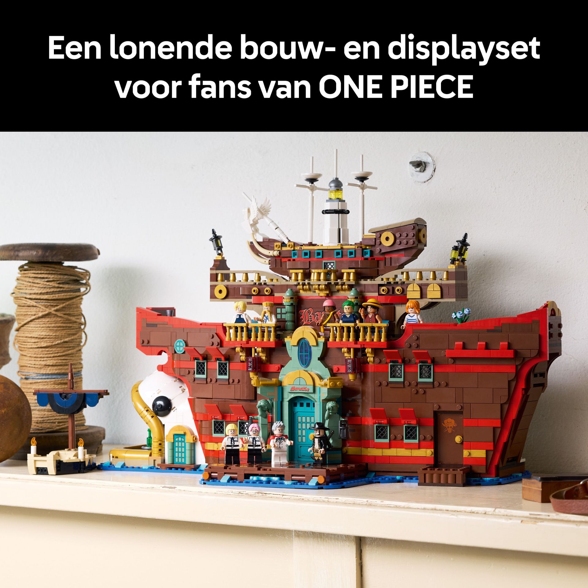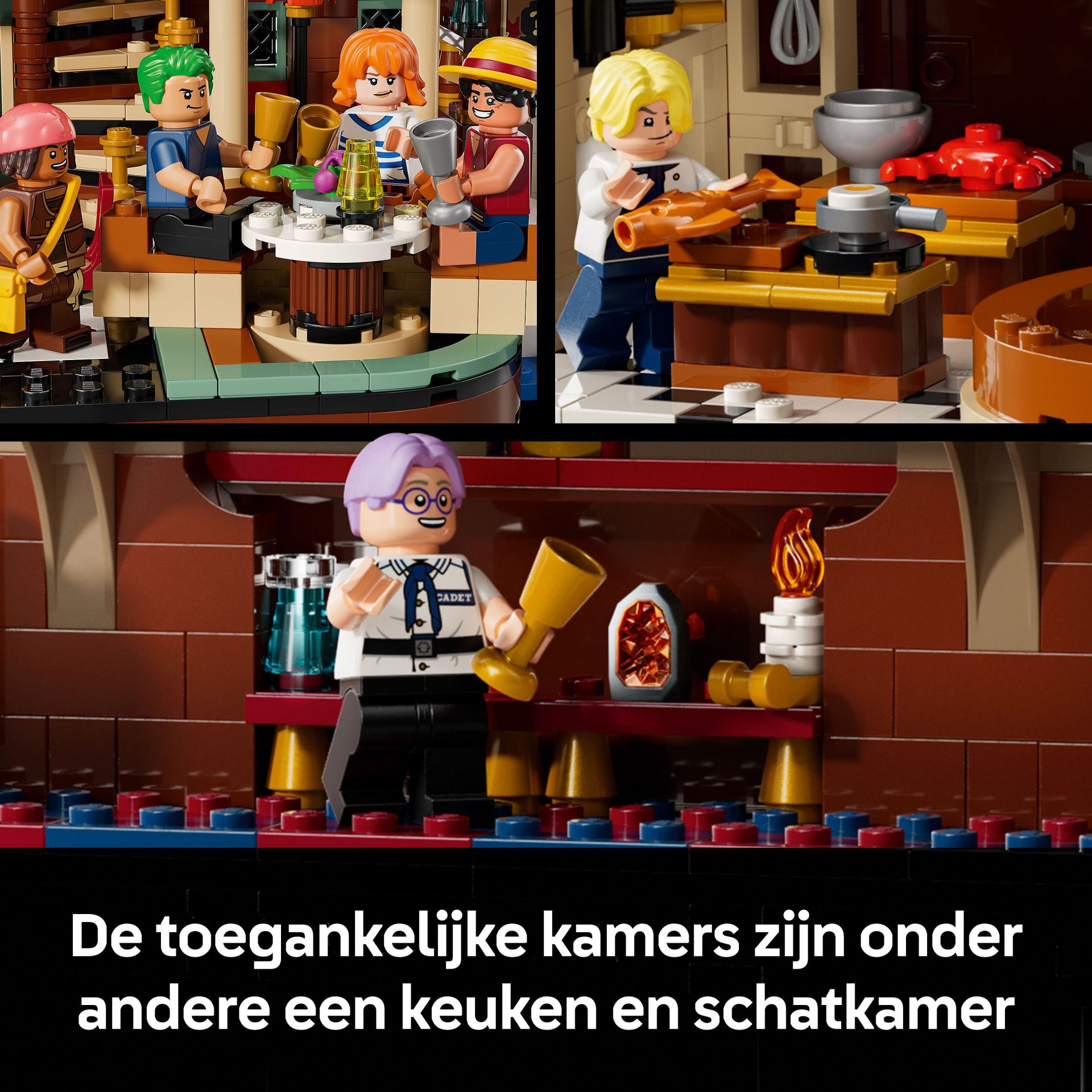 Dit indrukwekkende displaymodel in de vorm van een schip bevat diverse toegankelijke kamers, waaronder een keuken en eetgedeelte, de vertrekken van Zeff en een schatkamer. Speel klassieke scènes na met de 10 LEGO minifiguren van Luffy, Zoro, Nami, Usopp, Sanji, Zeff, Garp, Helmeppo, Koby en Mihawk. De set bevat ook authentieke accessoires, waaronder 5 'Wanted'-posters. Met de LEGO Builder app kunnen gebruikers inzoomen, modellen in 3D draaien en de voortgang bijhouden tijdens het bouwen.