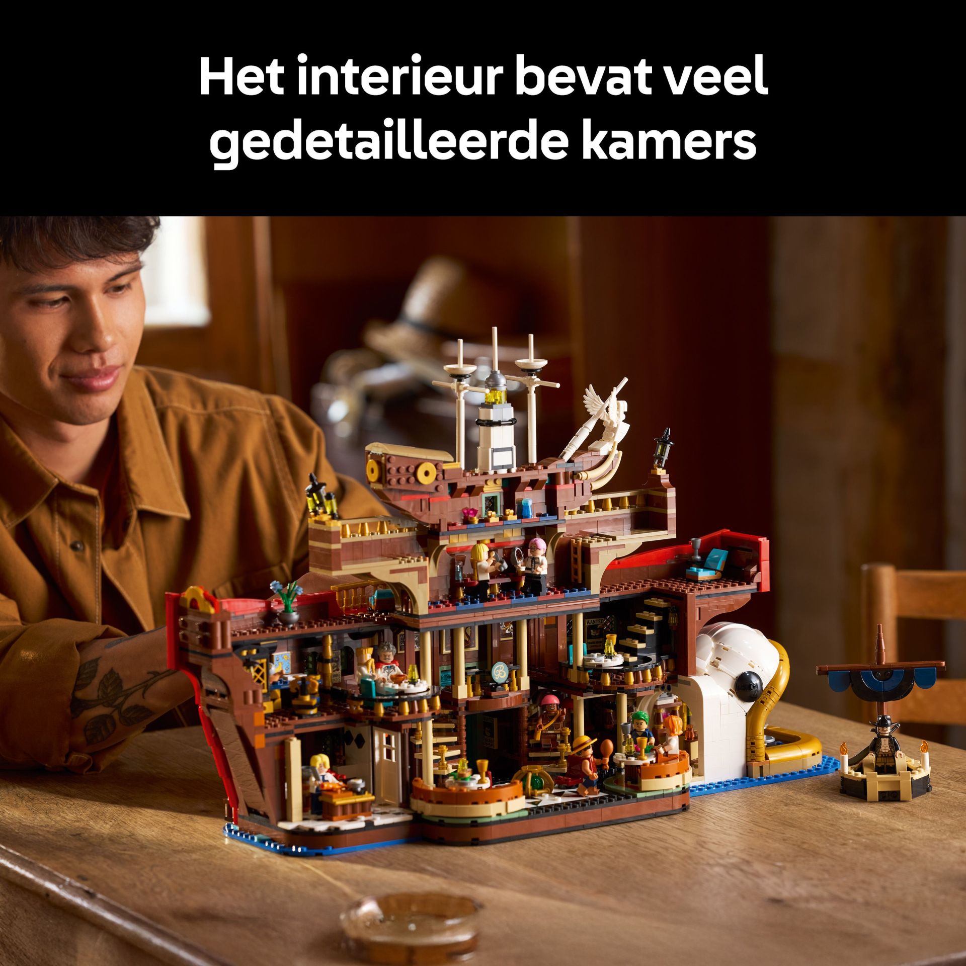 Gedetailleerd, toegankelijk interieur – dit displaymodel in de vorm van een schip bevat diverse kamers, waaronder een keuken en eetgedeelte, de vertrekken van Zeff en een schatkamer