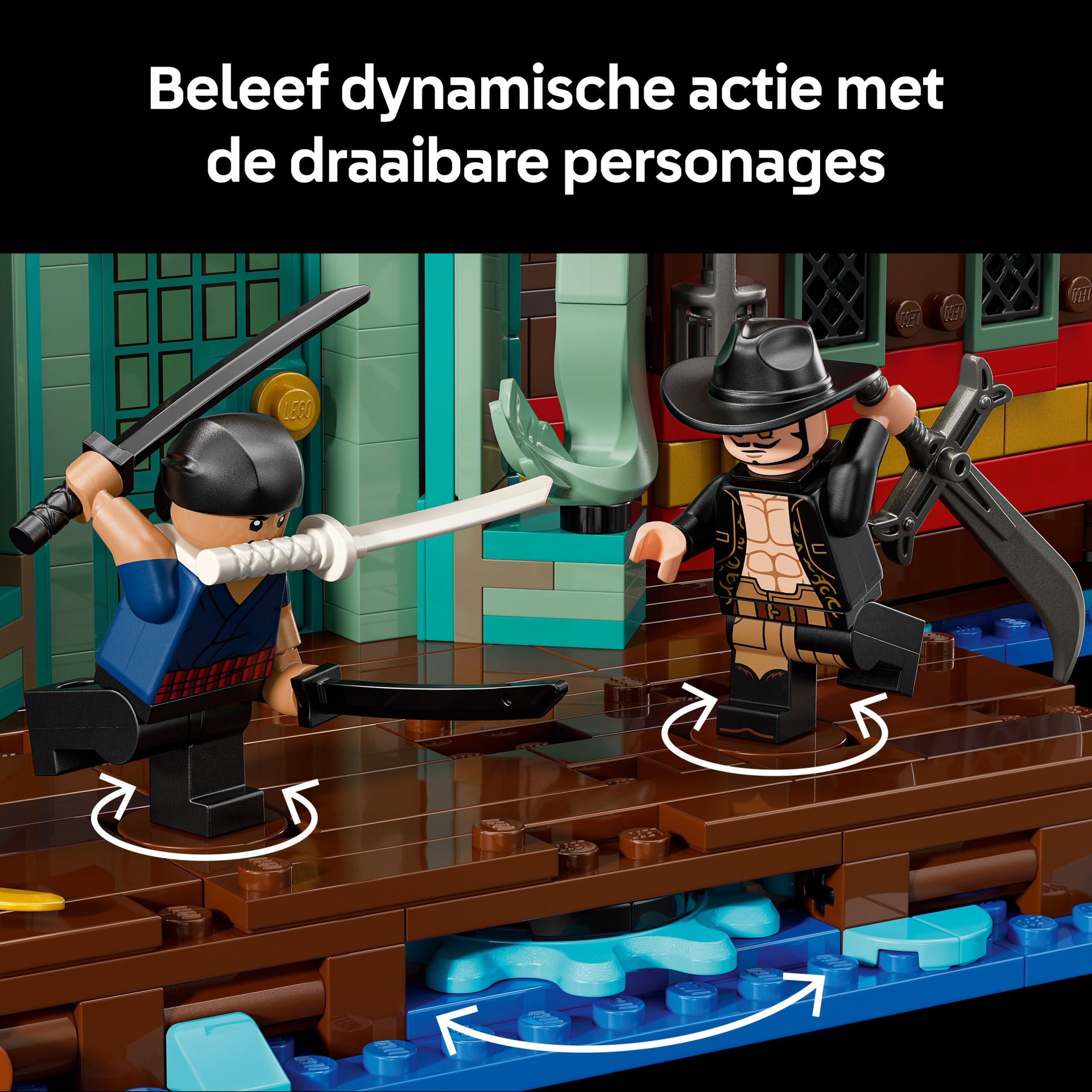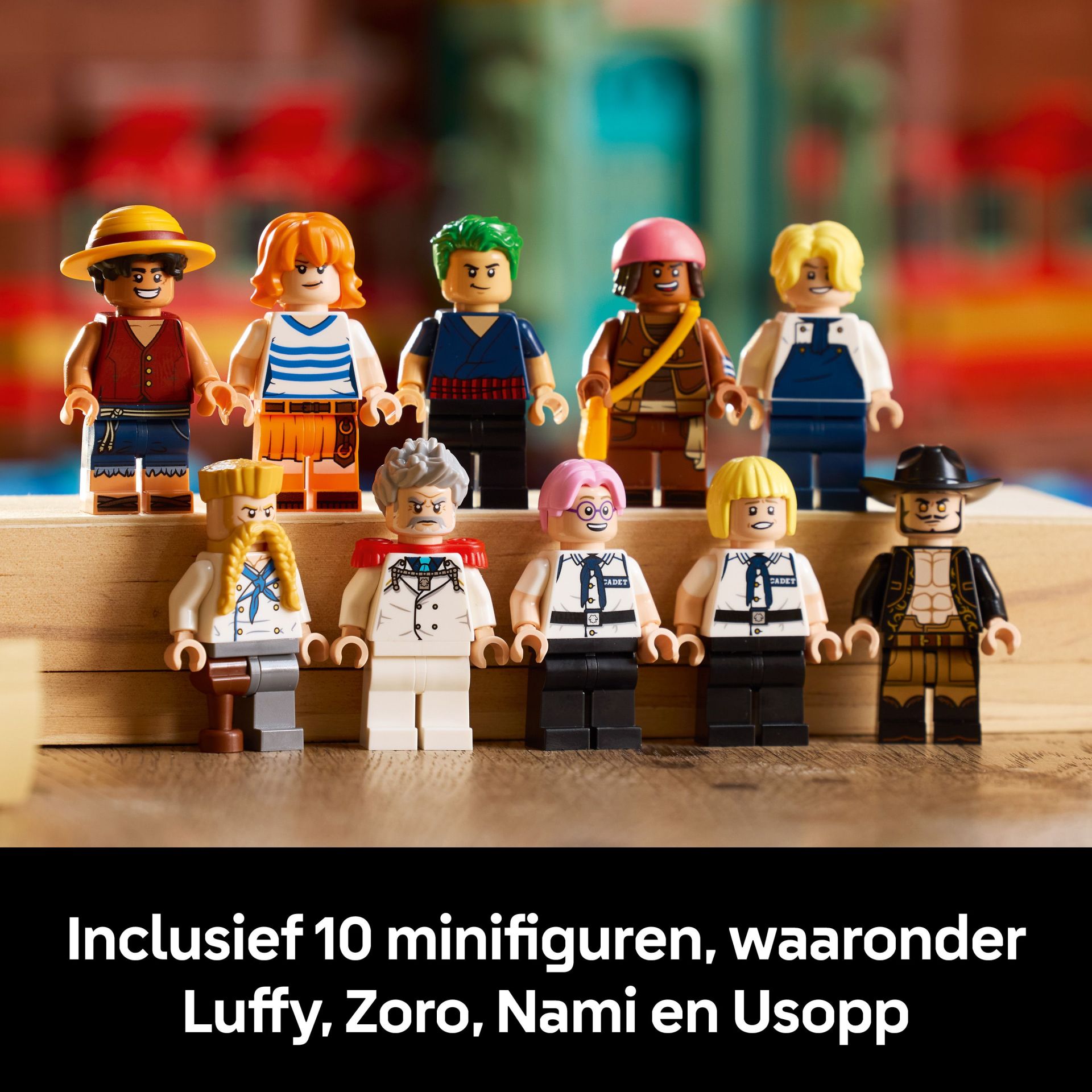 LEGO® minifiguren van onder andere Luffy, Zoro, Nami, Usopp en Sanji.