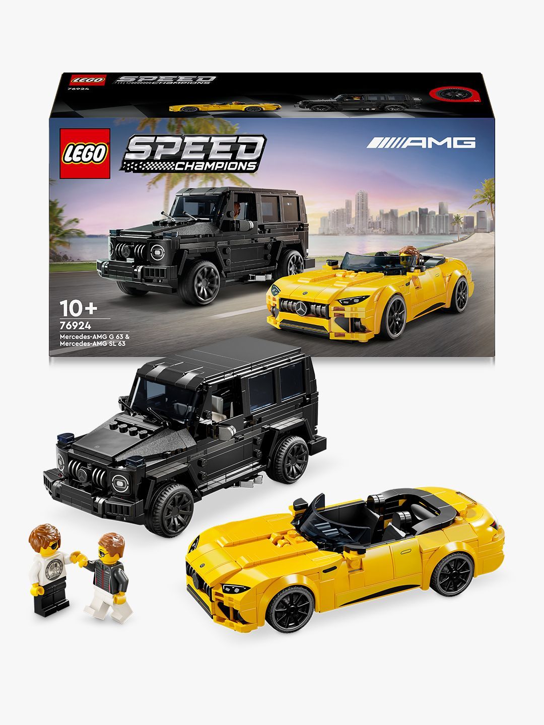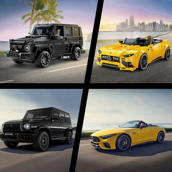 De zwarte Mercedes-AMG G 63 G-klasse en de gele Mercedes-AMG SL 63 cabriolet roadster bevatten authentieke designdetails van de echte versies, waaronder grilles aan de voorkant, motorkappen en interieurkenmerken. Elk Mercedes-AMG model is inclusief een minifiguur van een coureur, die kinderen achter het stuur kunnen plaatsen om te genieten van races op het circuit.