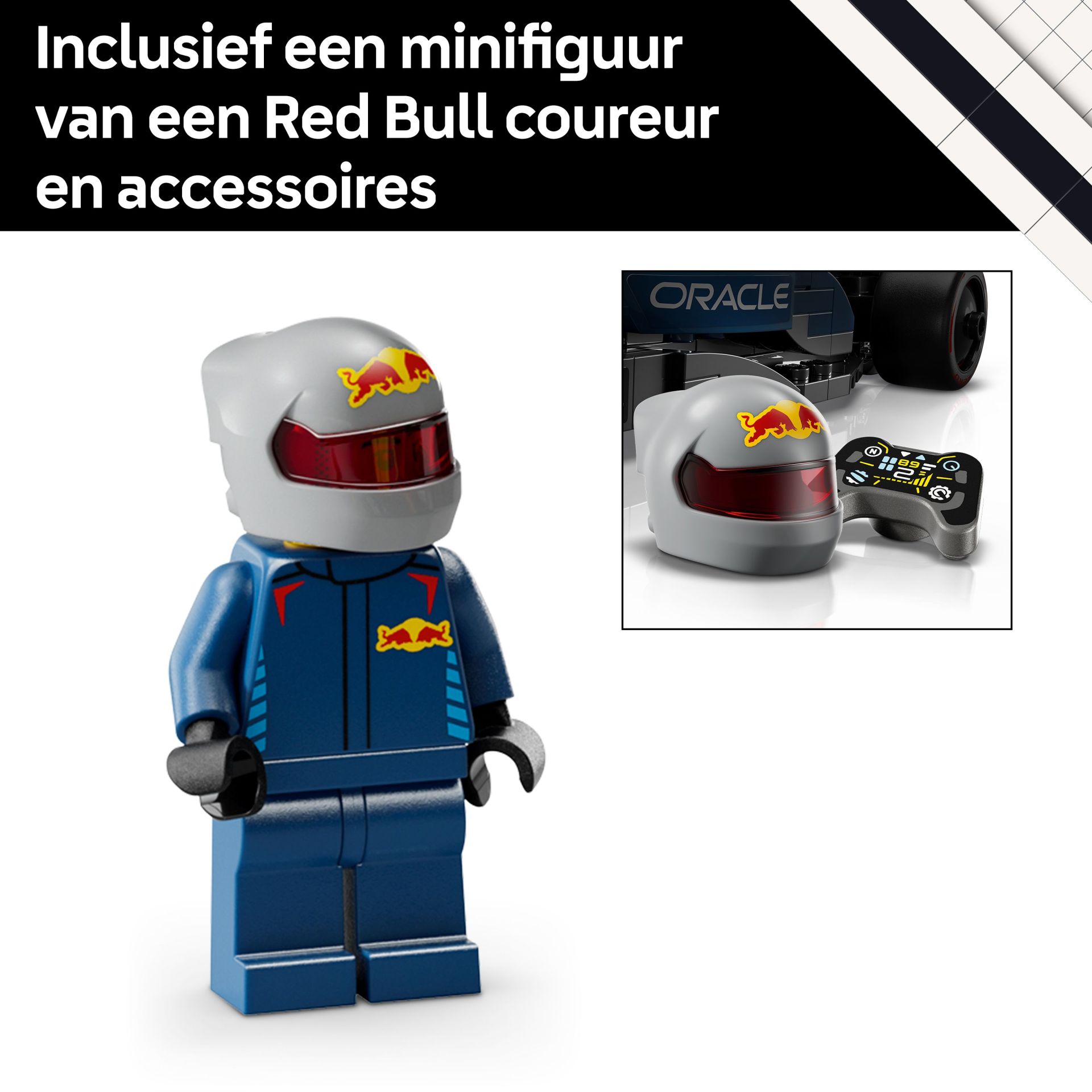 - F1 coureur minifiguur – de LEGO voertuig set bevat een minifiguur van een F1 coureur in een Red Bull-outfit en een helm om in de cockpit van de F1 racewagen te plaatsen