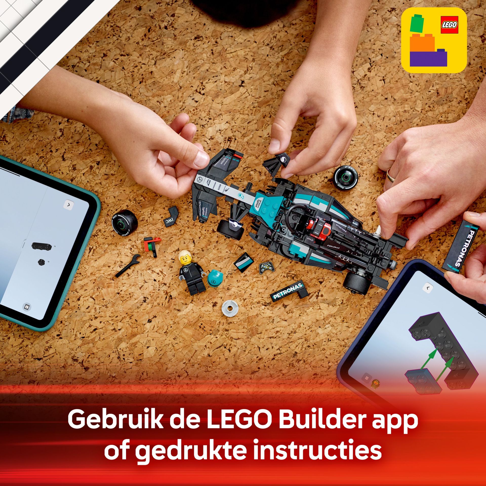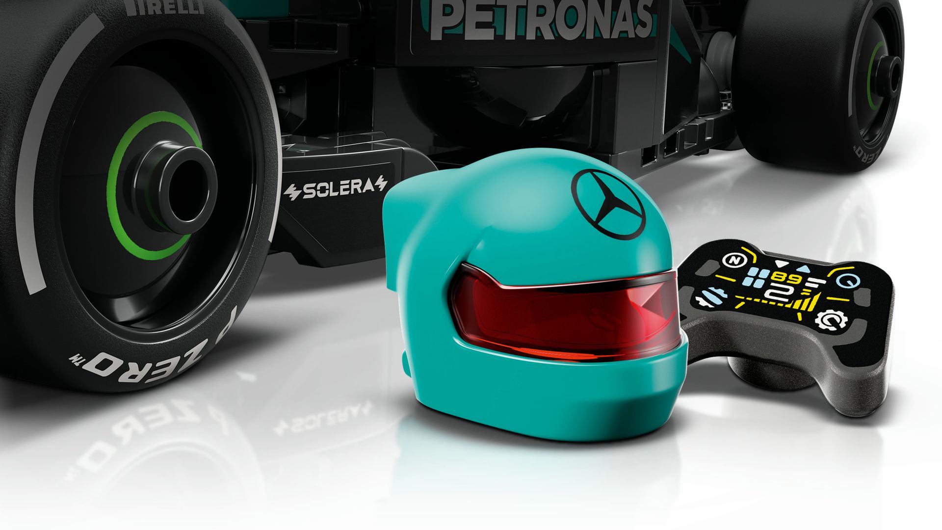 De Formule 1 auto heeft een cockpit die opent door de halo-balk op te tillen, een achtervleugel, wishbone-ophanging, sponsorstickers en bredere achterbanden bedrukt met 'Pirelli'. Het bouwbare schaalmodel van een F1 wagen wordt ook geleverd met een minifiguur van een F1 coureur in een Mercedes-AMG PETRONAS F1 Team-outfit en een helm om in de cockpit te plaatsen en mee te racen in spannende Formule 1 races.