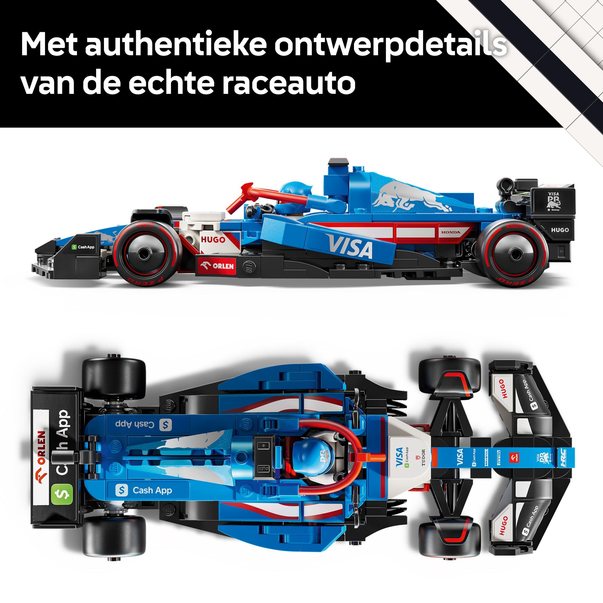 - LEGO auto boordevol authentieke RB details – deze LEFO F1 racewagen heeft ontwerpdetails van de echte versie uit 2024, waaronder sponsorstickers, een halo en bredere achterbanden met 'Pirelli' erop gedrukt