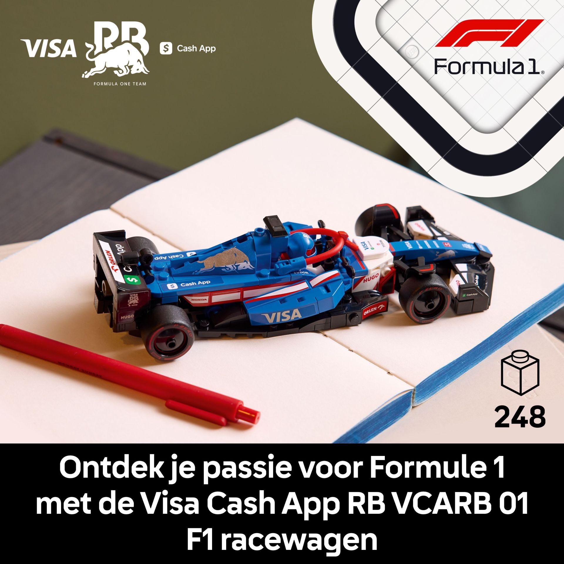 - 1 F1 coureur minifiguur – de LEGO voertuig set bevat een minifiguur van een Formule 1 coureur in een RB outfit met een helm die bouwers in de cockpit kunnen plaatsen om spannende race-actie na te spelen