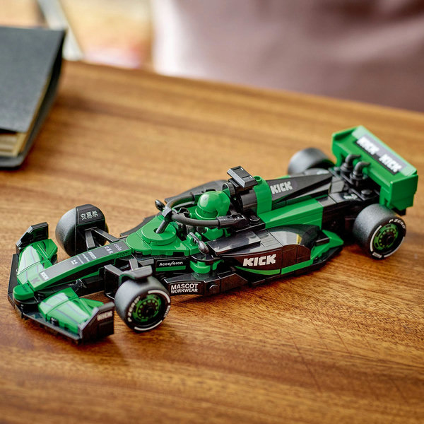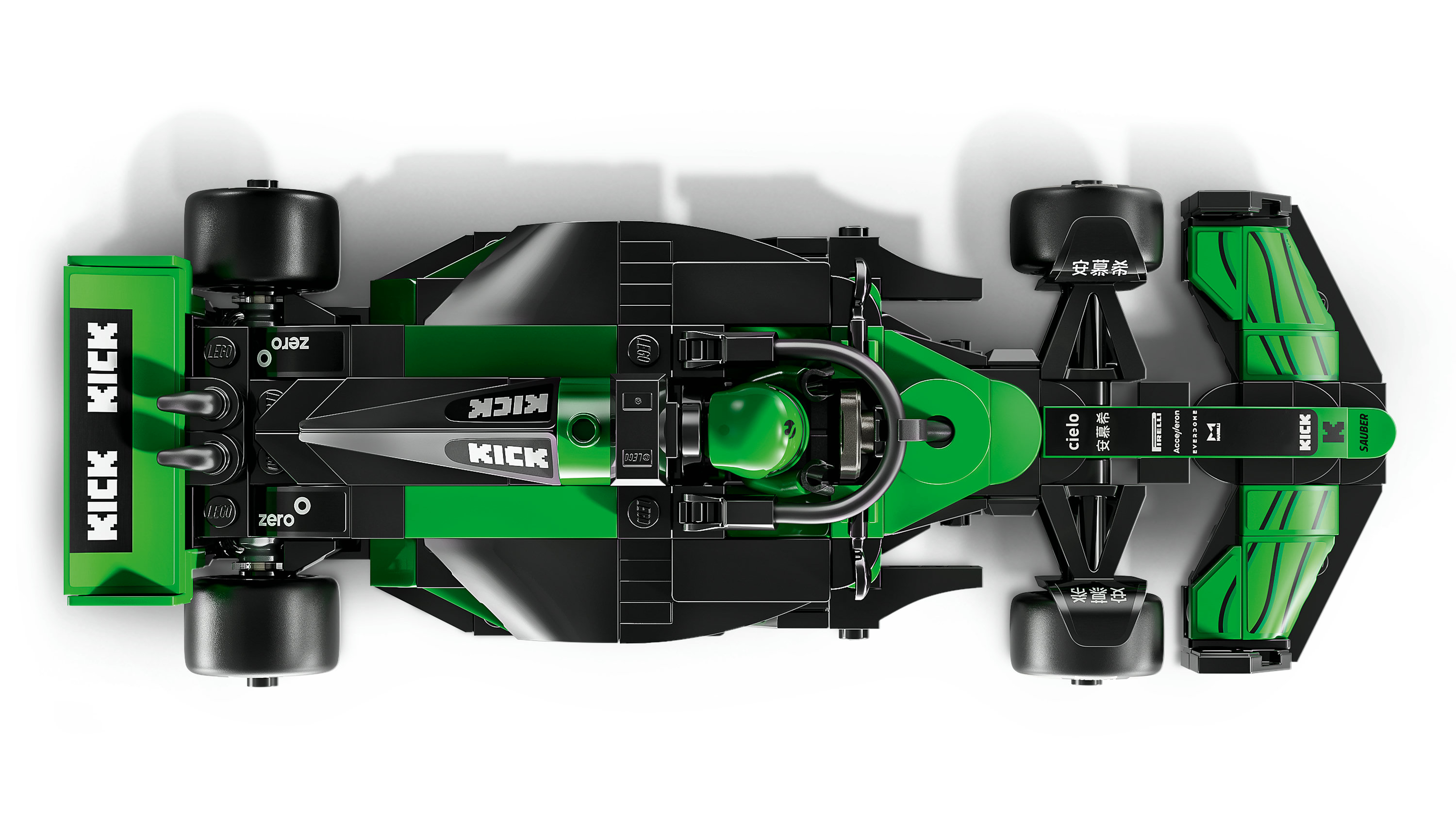 - LEGO auto boordevol authentieke KICK Sauber F1 Team details – een LEGO F1 modelauto met details van de echte versie uit 2024, inclusief achtervleugel, sponsorstickers en bredere achterbanden met 'Pirelli' erop gedrukt