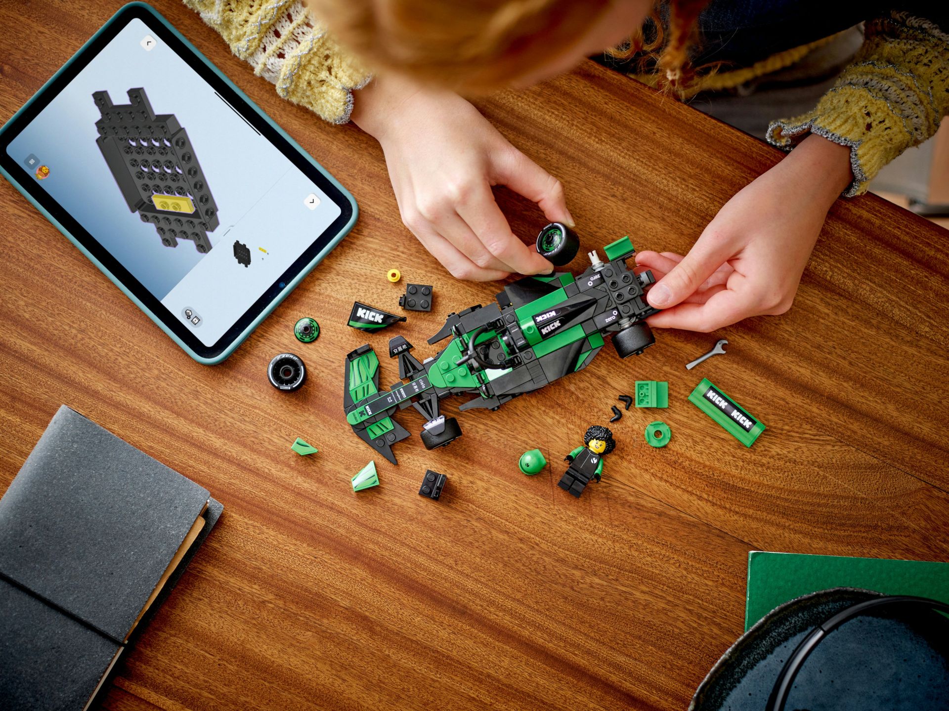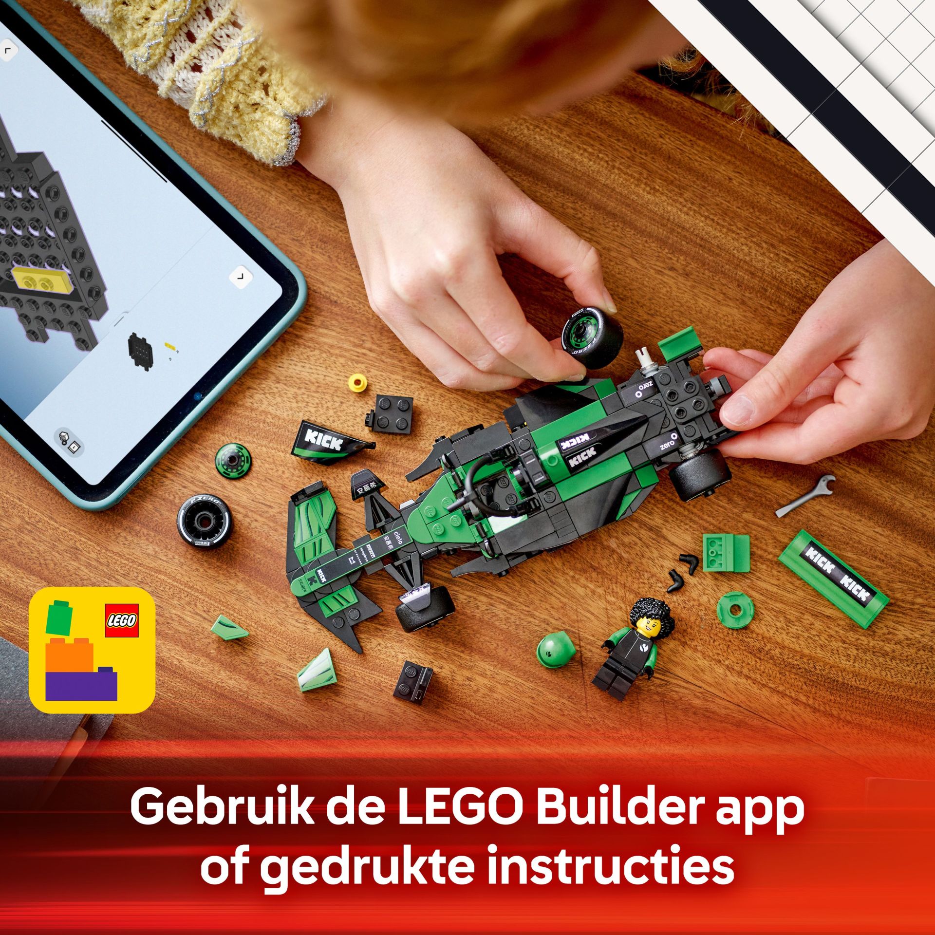 - 1 F1 coureur minifiguur – de LEGO voertuig set bevat een minifiguur van een coureur in een KICK Sauber F1 Team outfit met een helm die kinderen in de cockpit kunnen plaatsen om spannende F1 races te spelen