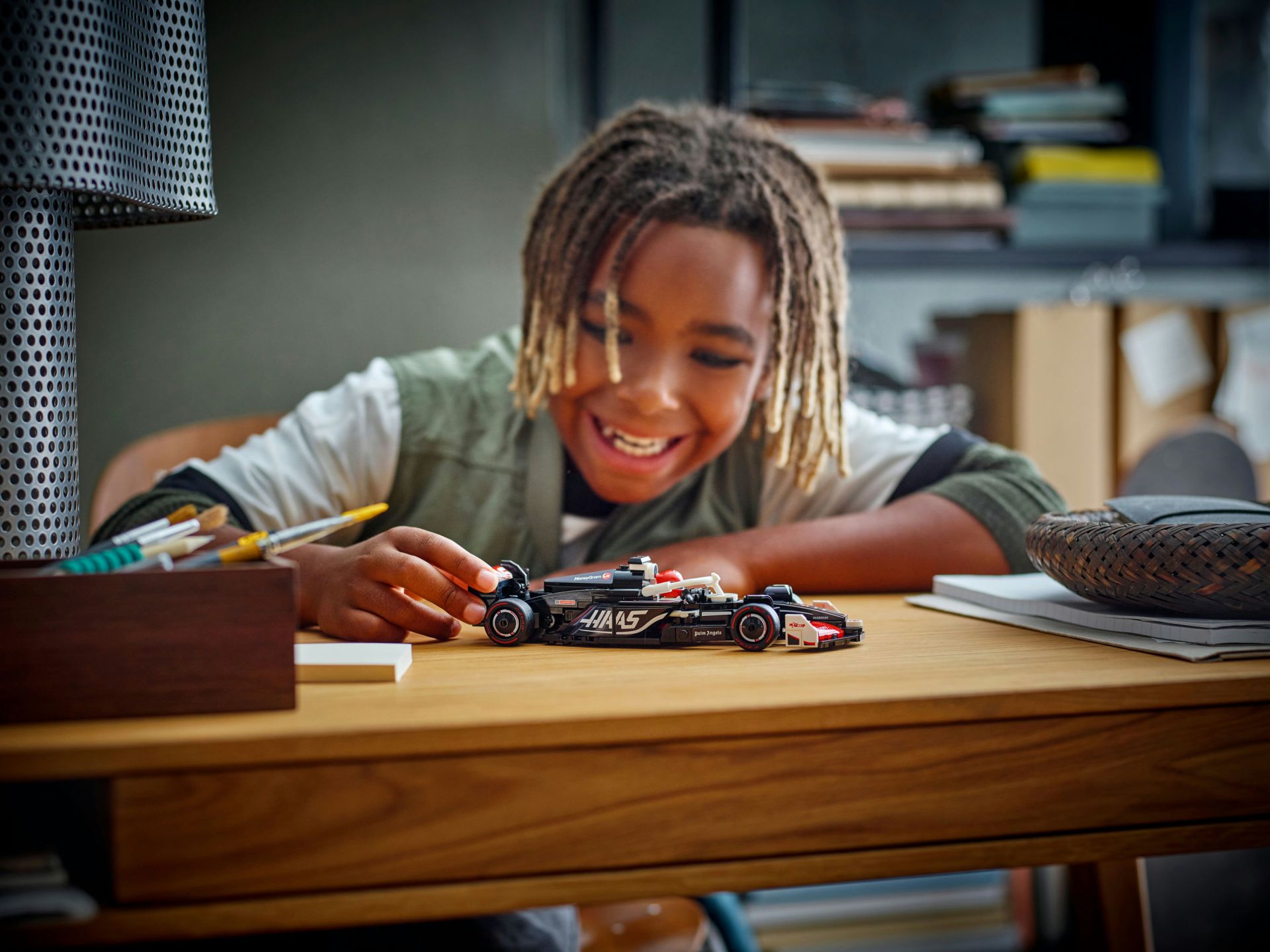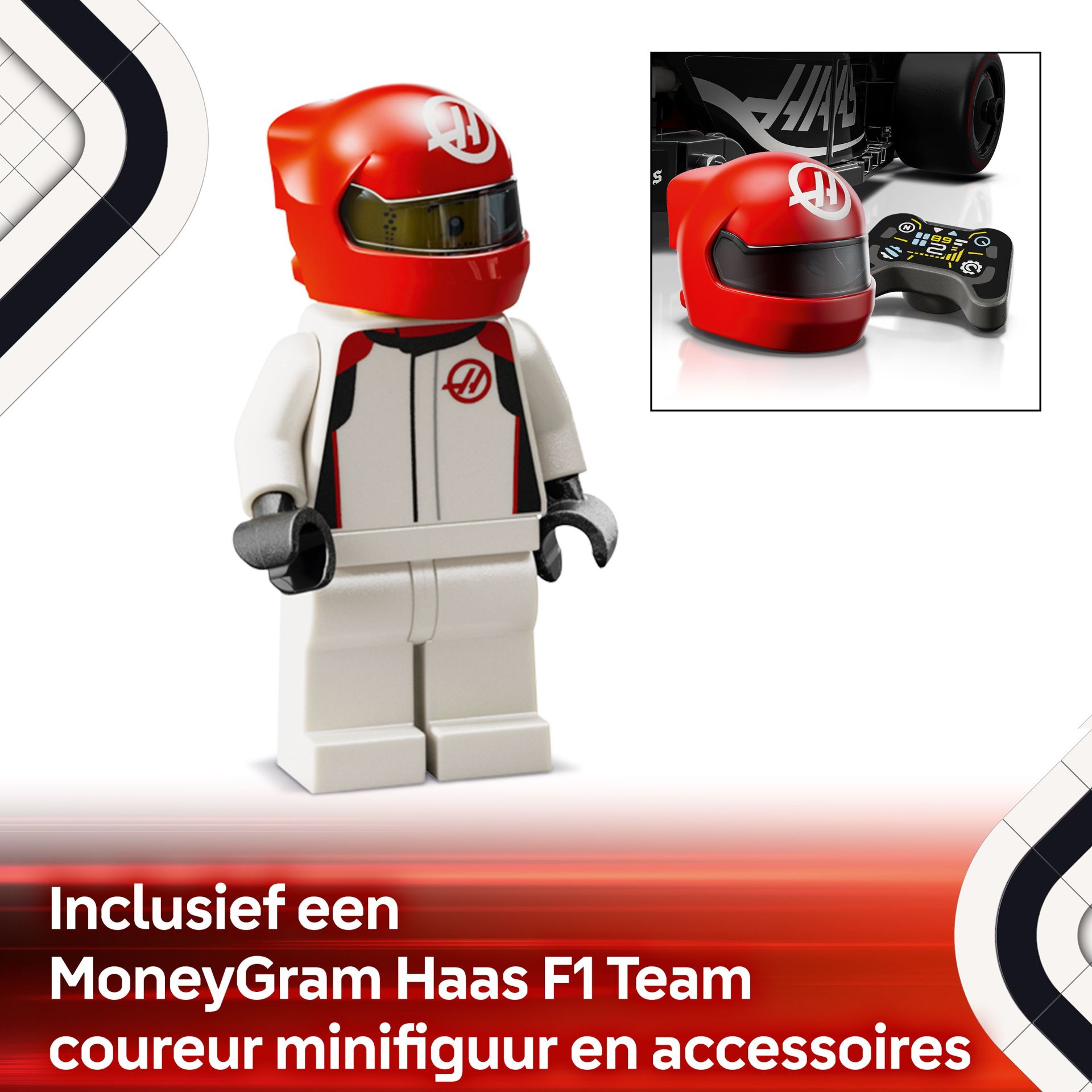 - 1 F1 coureur minifiguur – de voertuigset bevat een minifiguur van een coureur in een MoneyGram Haas F1 Team outfit met een helm die kinderen in de cockpit kunnen plaatsen om spannende race-actie na te spelen
