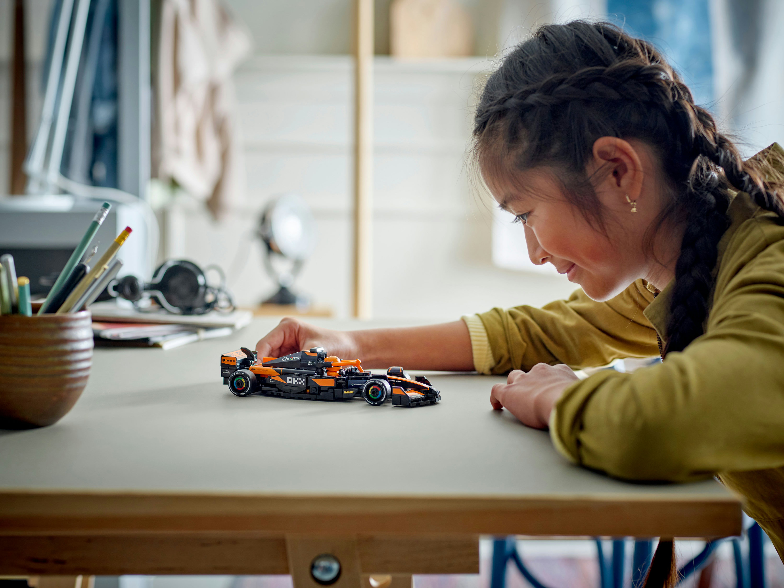 - 1 F1 coureur minifiguur – de LEGO voertuig set bevat een minifiguur van een Formule 1 coureur in een McLaren outfit met een helm die kinderen in de cockpit kunnen plaatsen om spannende F1 races na te spelen