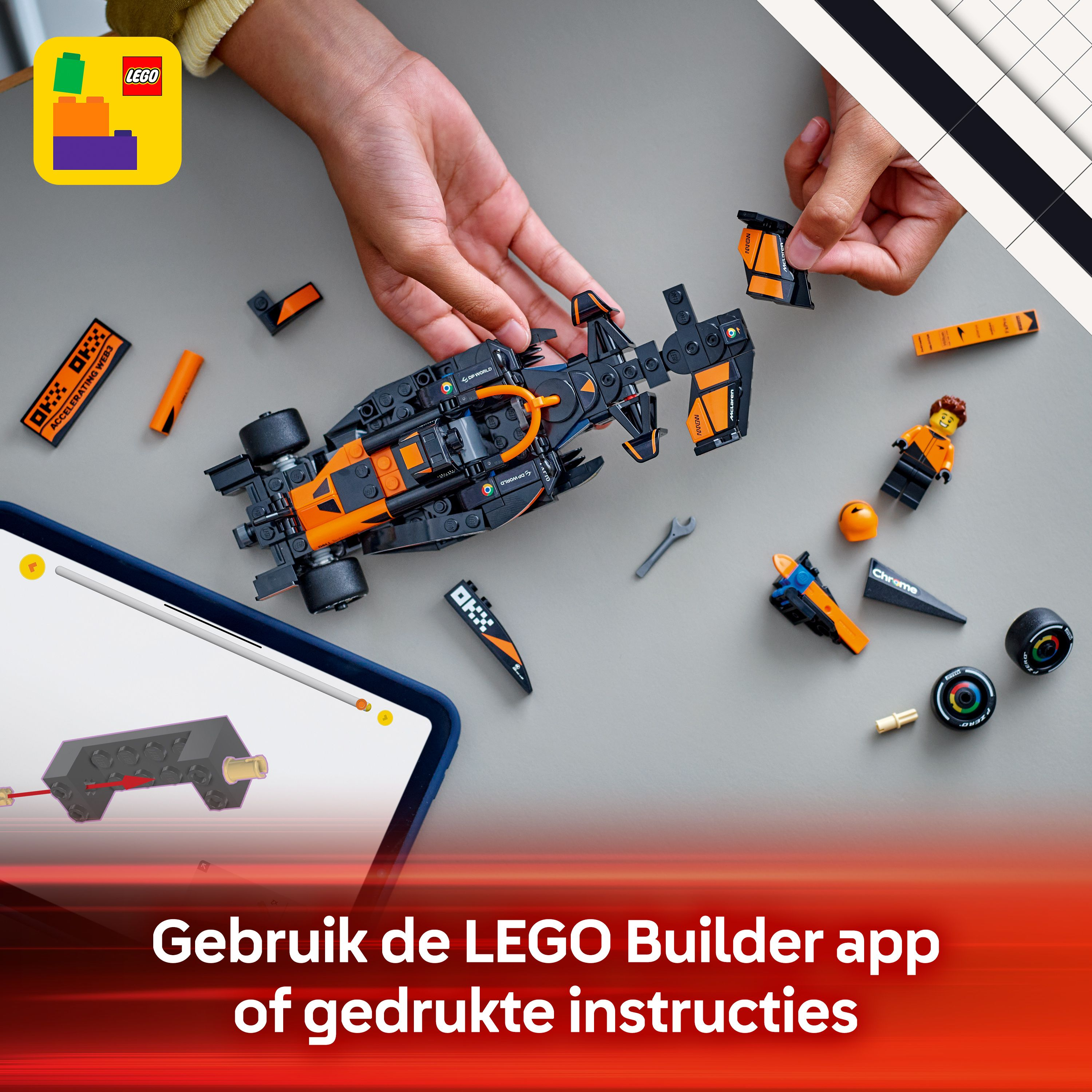 - LEGO auto boordevol authentieke McLaren F1 Team details – een McLaren auto met details van de echte versie uit 2024, inclusief halo, achtervleugel, sponsorstickers en bredere achterbanden met 'Pirelli' erop gedrukt