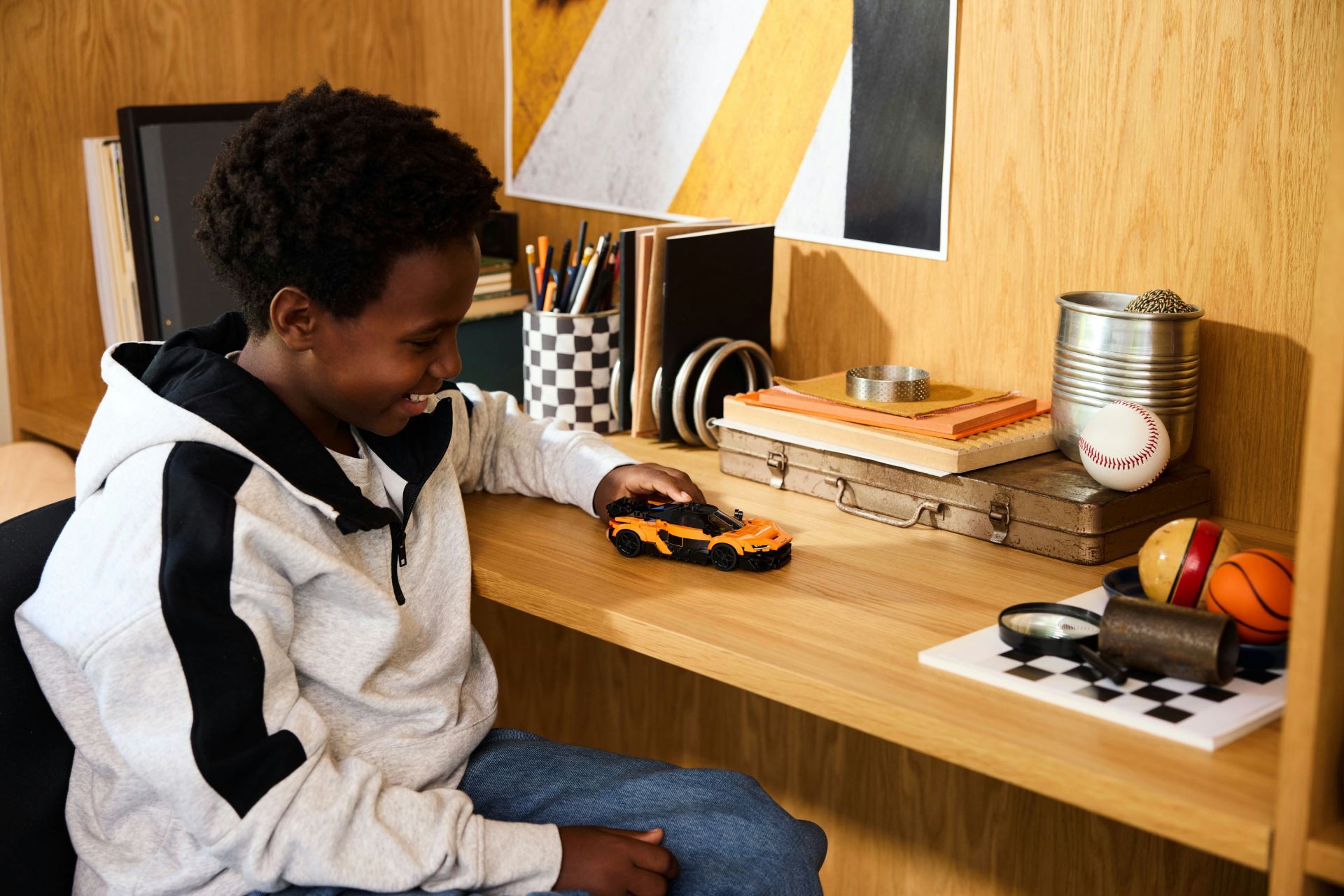 AUTHENTIEKE DETAILS – met ontwerpdetails van de echte supercar, waaronder een verstelbare achtervleugel voor cruisen of racen, een motor achterin, een cockpit en een infotainmentscherm