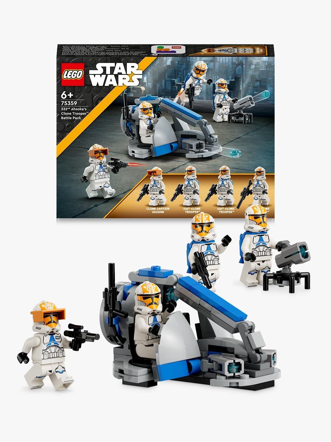 Kinderen kunnen Star Wars: The Clone Wars scènes en hun eigen missies naspelen met het 332nd Ahsoka's Clone Trooper Battle Pack (75359). De set bevat 4 LEGO Star Wars minifiguren: een LEGO minifiguur van Clone Captain Vaughn die nieuw is vanaf augustus 2023 met een speciale helm en 3 332nd Clone Troopers, plus een blastergeweer, 3 blasters en 2 jetpack accessoires.