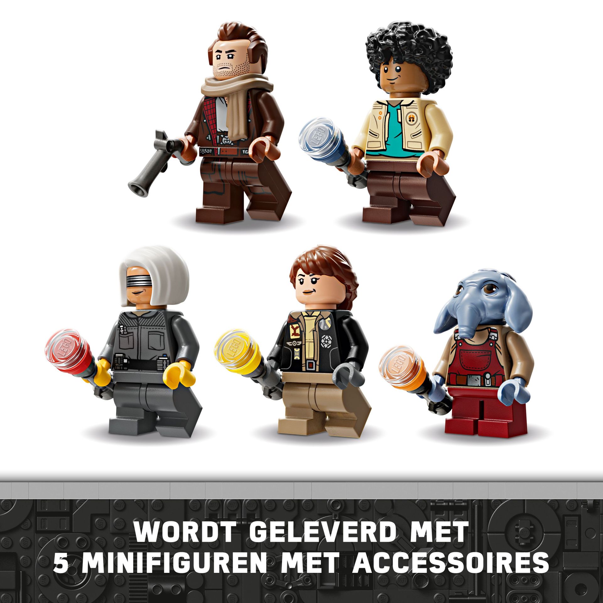 5 LEGO® Star Wars™ personages – een LEGO minifiguur van Jod met een blaster in vintagestijl, plus Wim, KB, Fern en Neel LEGO minifiguren, elk met een bouwbaar zaklampaccessoire