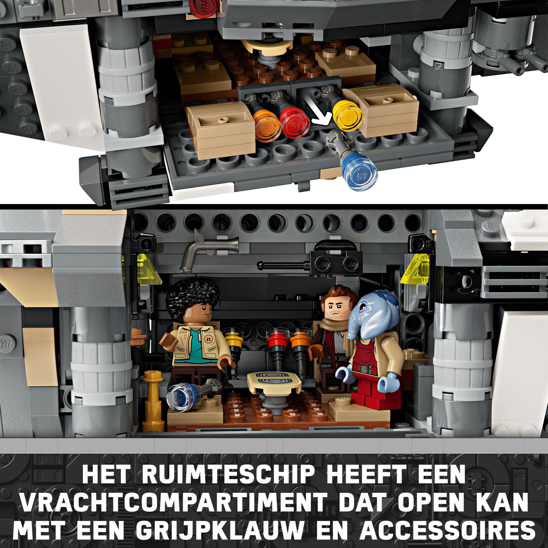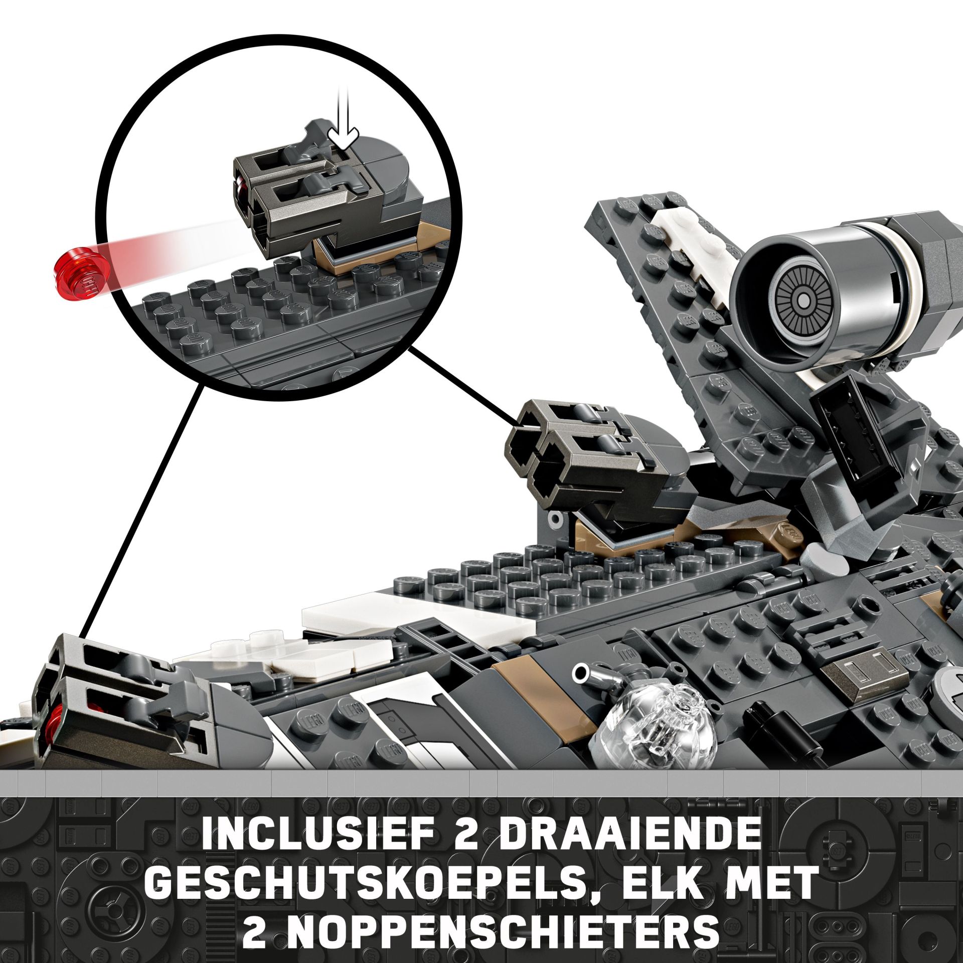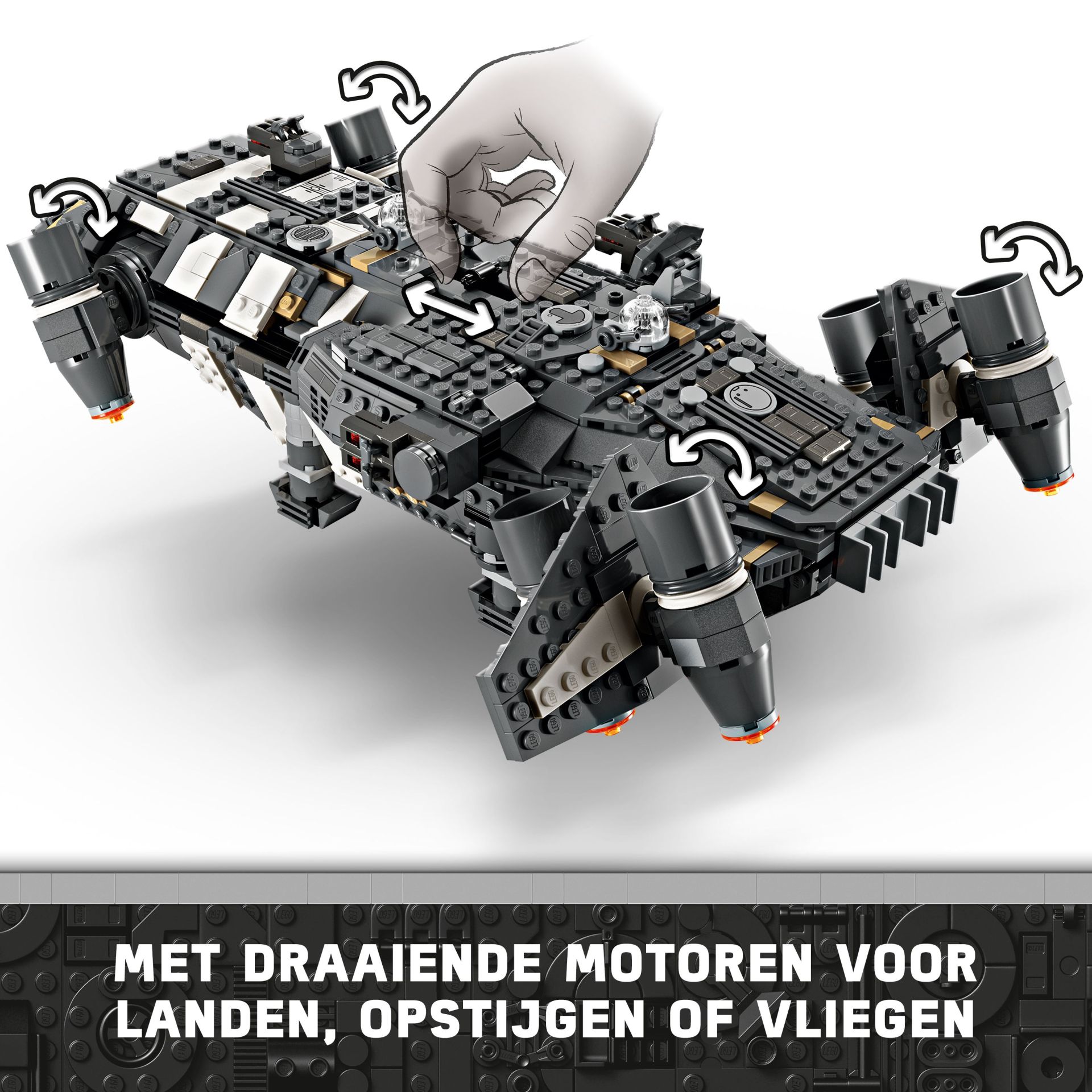 Authentieke kenmerken – dit bouwpakket voor kinderen bevat een cockpit, ruimte met zitplaatsen voor 4 LEGO minifiguren, draaibare motoren voor landen/opstijgen of vliegen, 2 noppenschieters en 2 draaiende geschutskoepels, elk met 2 noppenschieters