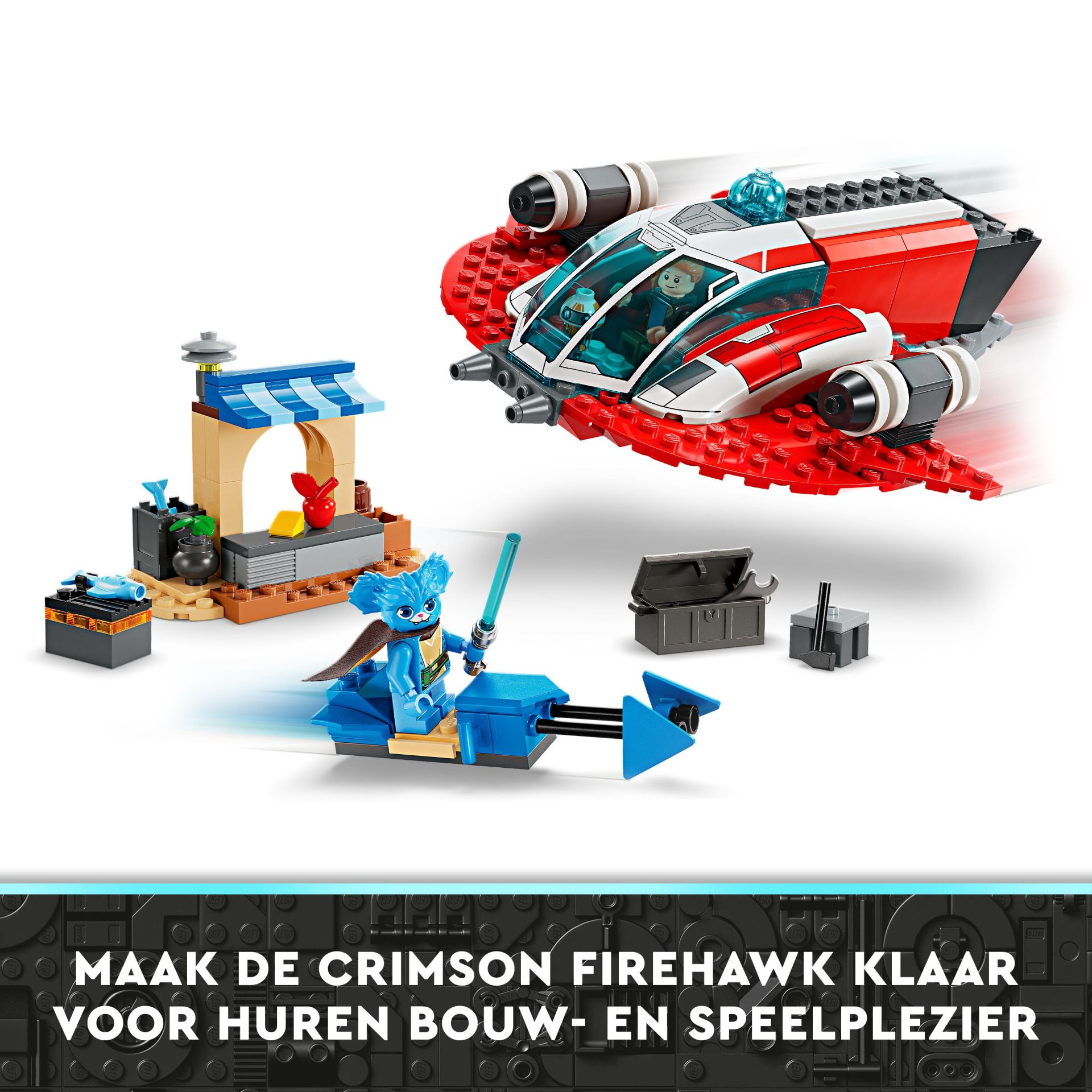 Laat kinderen van 4 jaar en ouder kennismaken met bouwen en spelen in het LEGO Star Wars universum met dit bouwpakket met het Crimson Firehawk bouwbaar speelgoed ruimteschip uit Star Wars: Young Jedi Adventures. Het model heeft een startsteenbasis en er is ruimte voor alle 3 de meegeleverde Star Wars personages (Nash Durango en Nubs LEGO minifiguren, plus een RJ-83 LEGO droid figuur) in de cockpit. De set bevat ook een bouwbare Star Wars speeder bike die in het ruimteschip past, plus een kleine marktplaats.