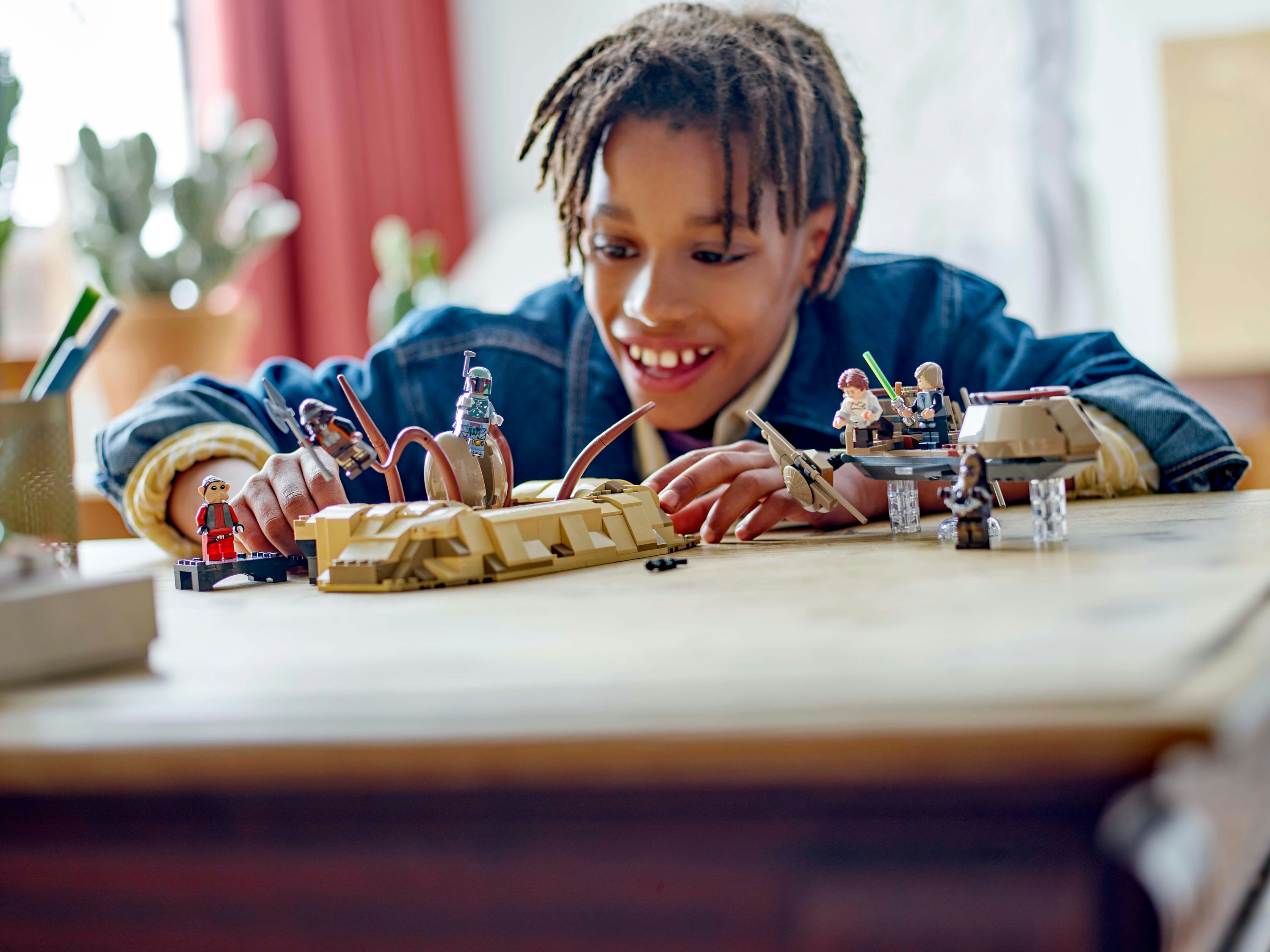 Bouwbaar LEGO Star Wars speelgoed voertuig – de Desert Skiff heeft doorschijnende elementen voor een zweefeffect, een plank waar Luke Skywalker over kan lopen en de uitklapbare reling waar Han Solo bijna van af viel
