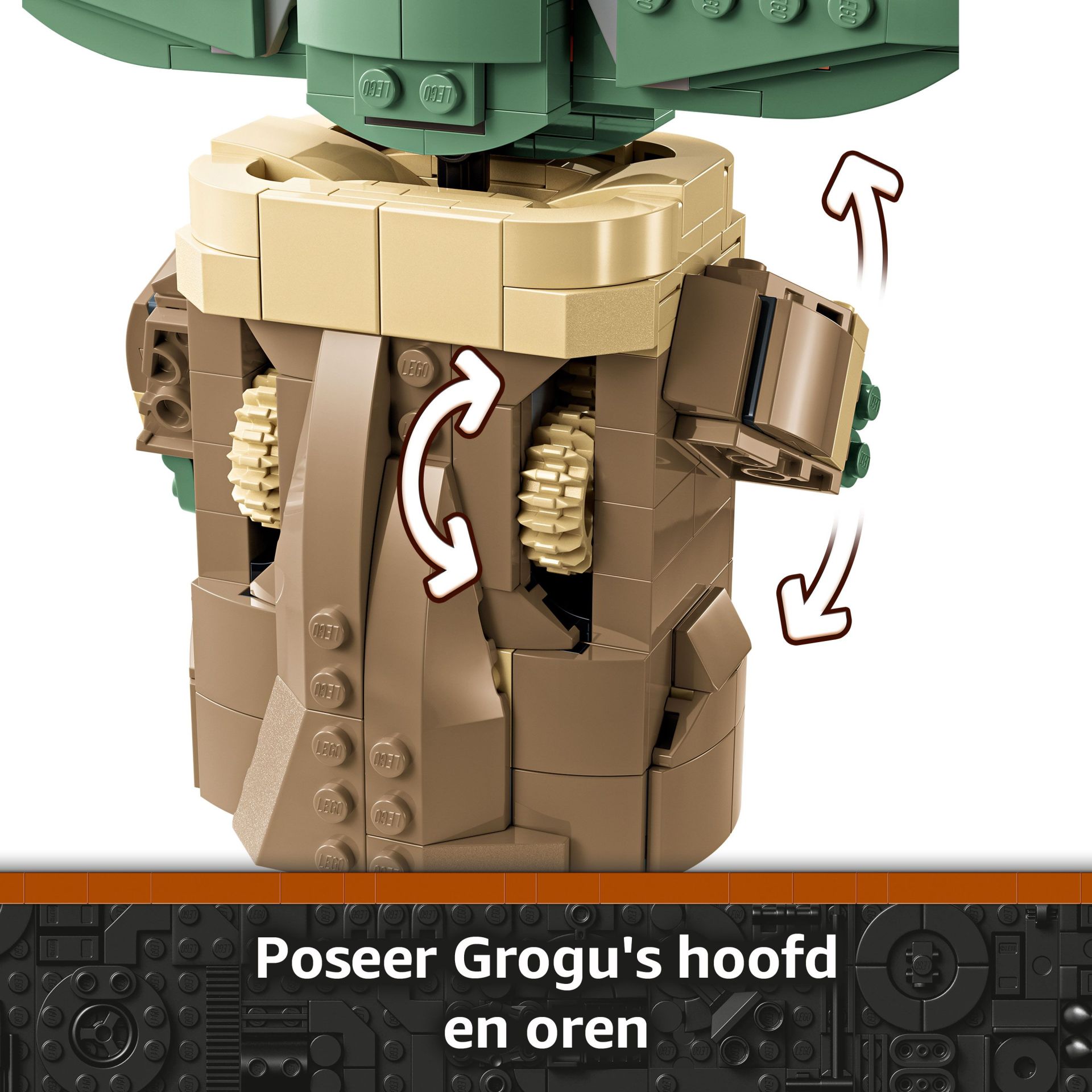 - Grogu LEGO figuur – het hoofdmodel wordt geleverd met een Grogu informatieplaatje op een standaard, met ruimte voor de meegeleverde Grogu LEGO figuur van standaardformaat in een kleine zweefkinderwagen om zelf te bouwen