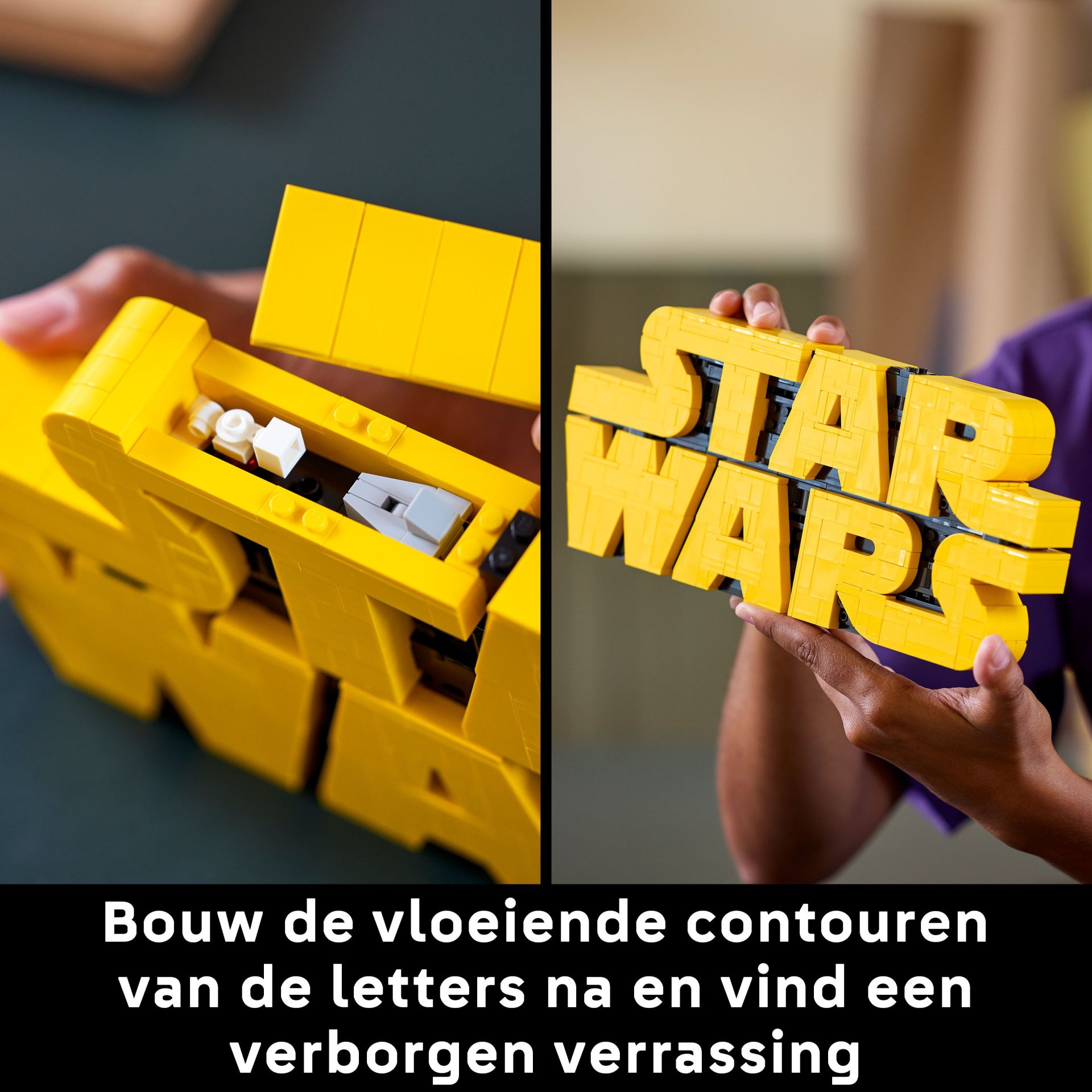 Neem de tijd om van je passie te genieten en duik in een leuk en boeiend creatief project. Leg de vloeiende vormen van elke gele letter vast en voeg klassieke LEGO bouwdetails toe aan de zwarte gedeelten tussen de letters. Ontdek ook de leuke verrassing die is verborgen in de 'T' van Star Wars.
