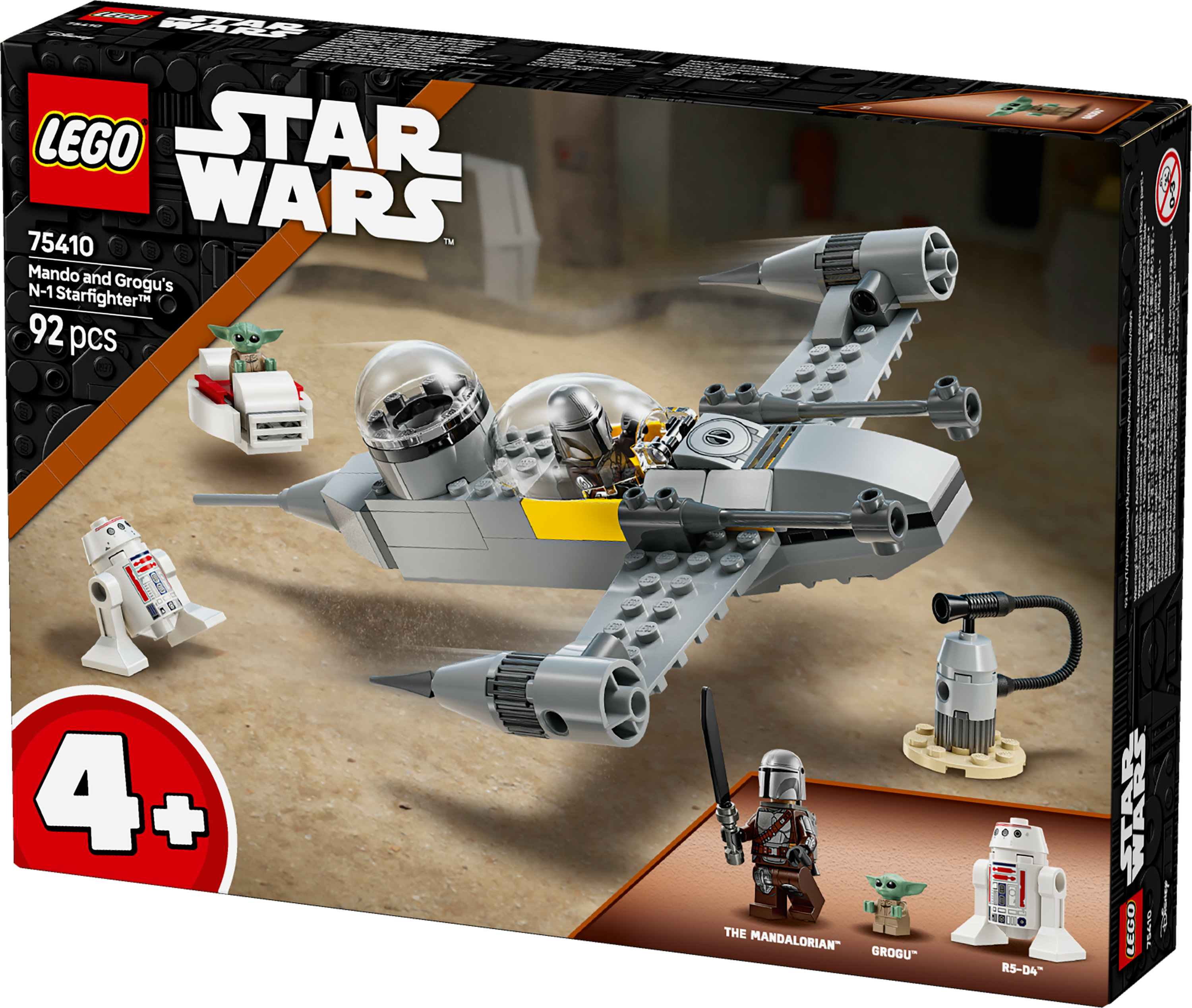 Deze N-1 Starfighter modelbouwset is inclusief 3 LEGO Star Wars personages: de Mandalorian met een darksaber en jetpack, Grogu met een zweefkinderwagen en de droid R5-D4. Plaats de Mandalorian in de cockpit van de N-1 Starfighter en zet Grogu in de passagiersruimte achterin voor urenlange rollenspellen.