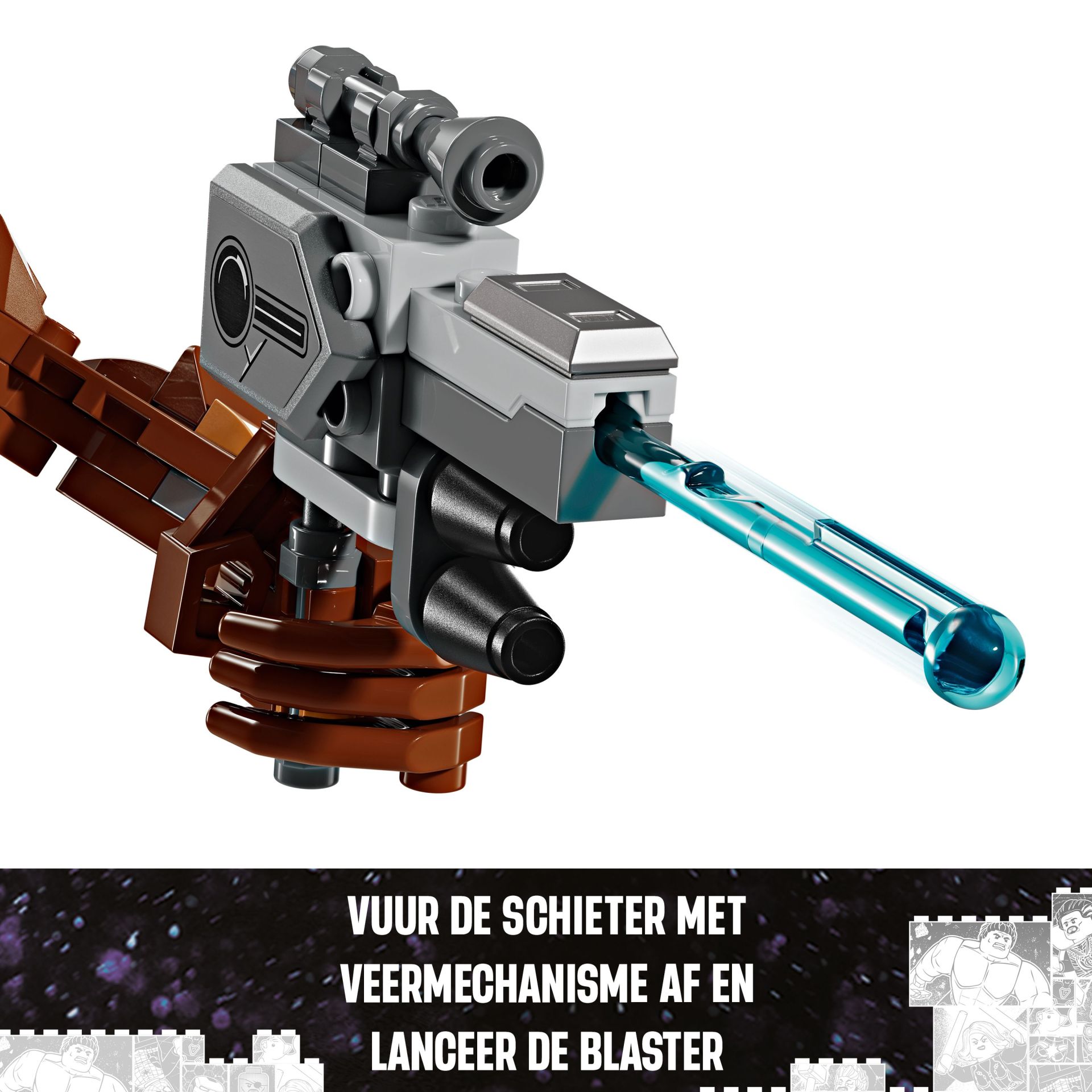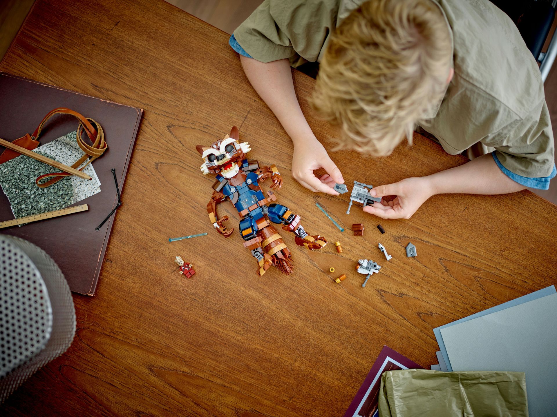Het verstelbare, bouwbare model weerspiegelt de rebelse houding en liefde voor wapens van de held. Alle ledematen van deze LEGO Marvel figuur (behalve de ellebogen) zijn beweegbaar voor maximale speel- en displaymogelijkheden. Het personage houdt een schieter met veermechanisme en blaster in zijn handen en op zijn schouder zit zijn schattige metgezel, Baby Groot.