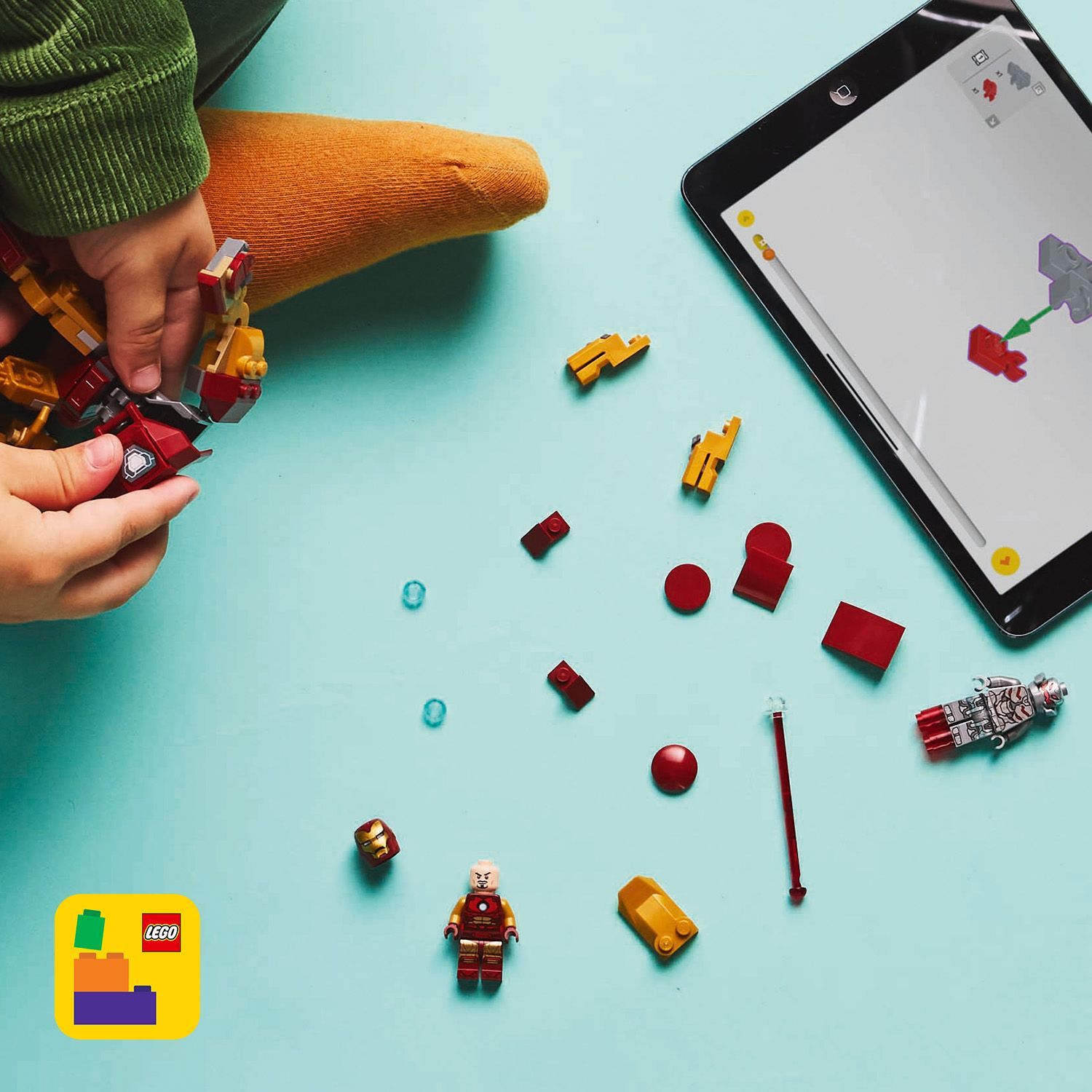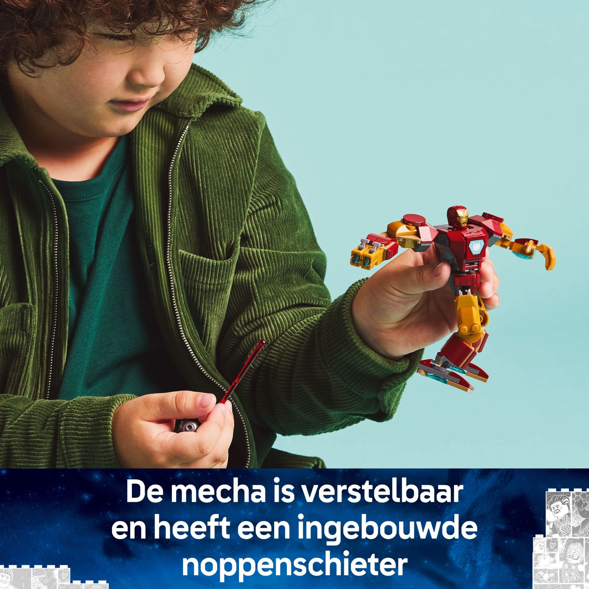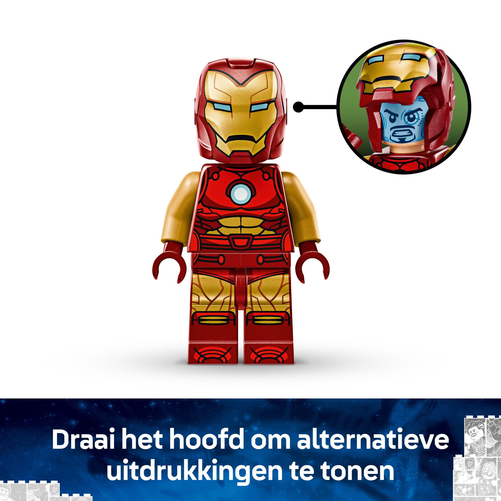 - Bouwbare Iron Man mecha – de verstelbare figuur heeft beweegbare armen, benen en vingers en de romp kan open en bevat een cockpit waar de Iron Man minifiguur in kan zitten