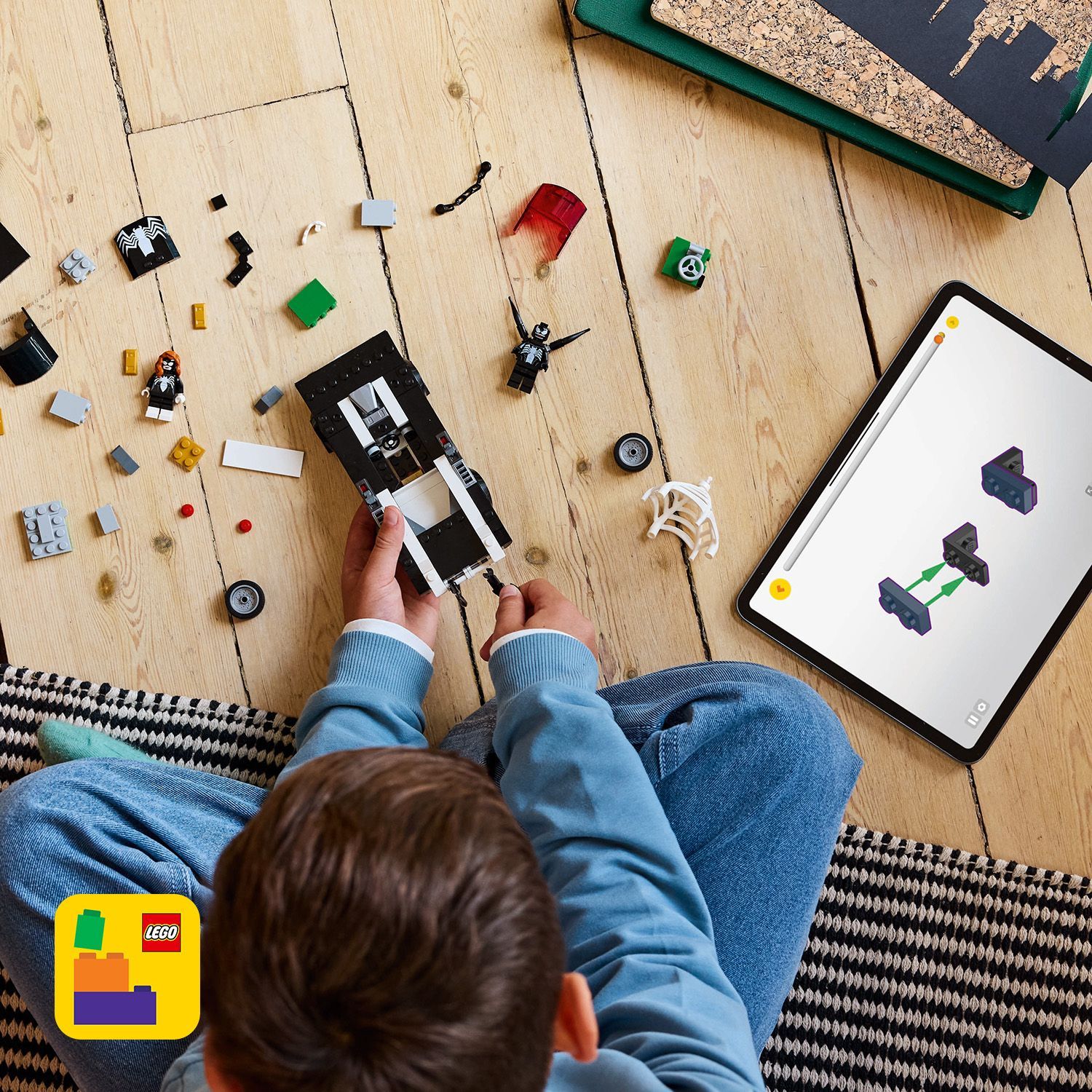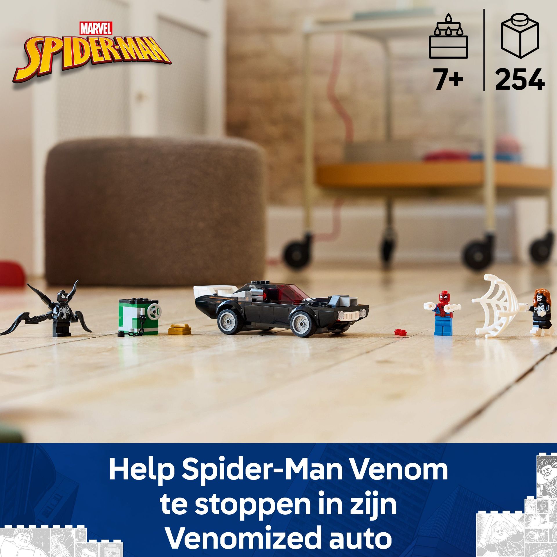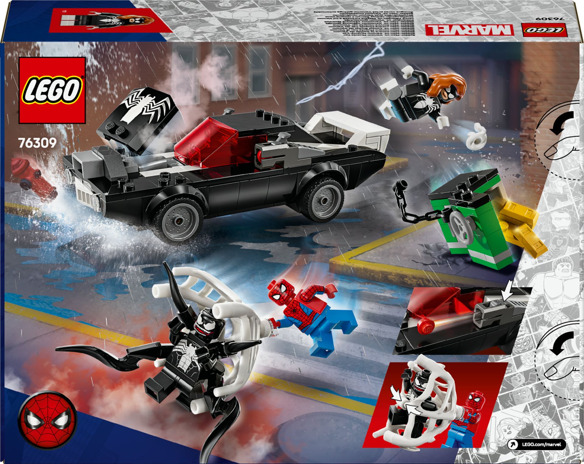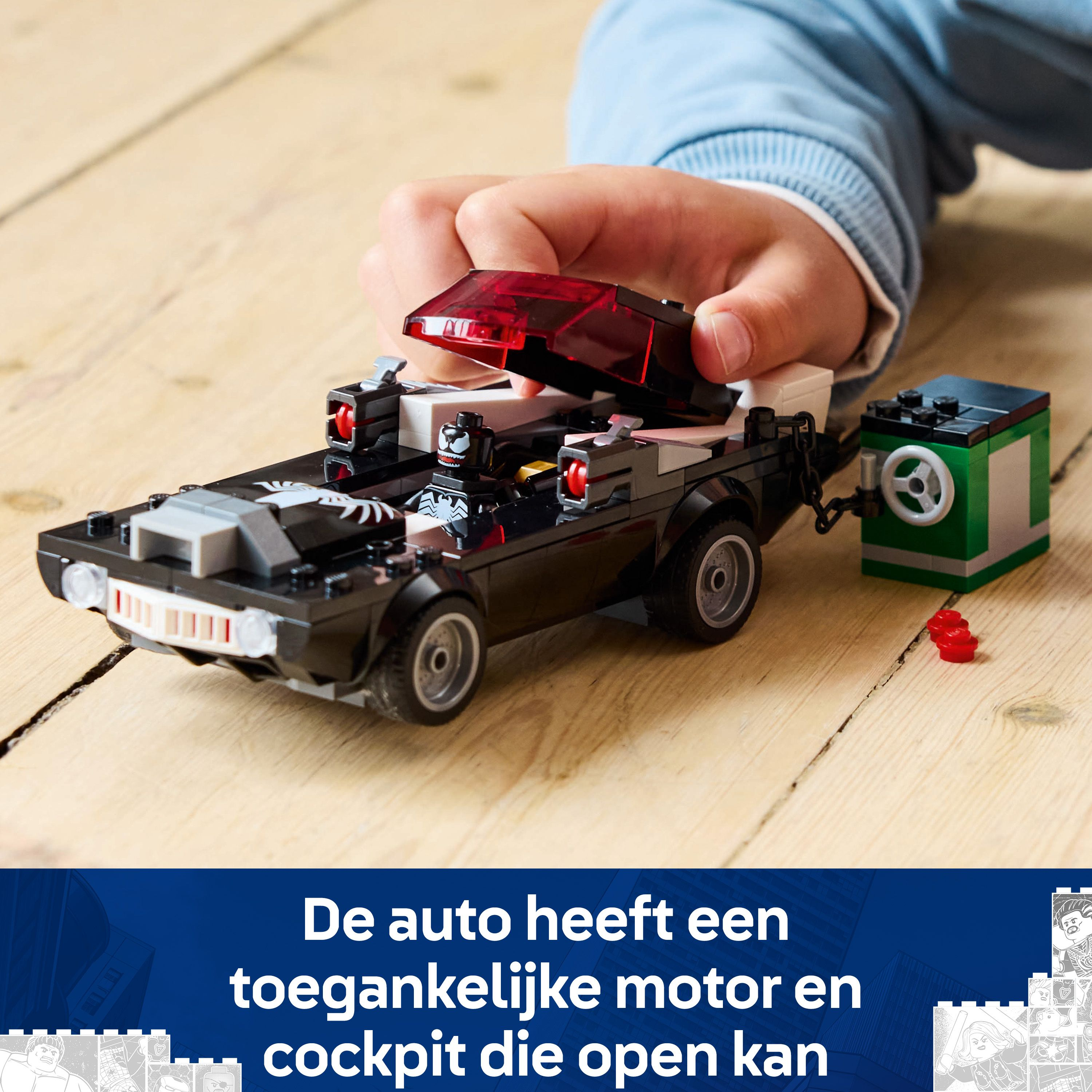 - Venom auto-achtervolging – de Venom minifiguur kan in de LEGO auto worden geplaatst door zijn onderste 2 tentakels te verwijderen en deze te gebruiken om de auto verder te Venomizen