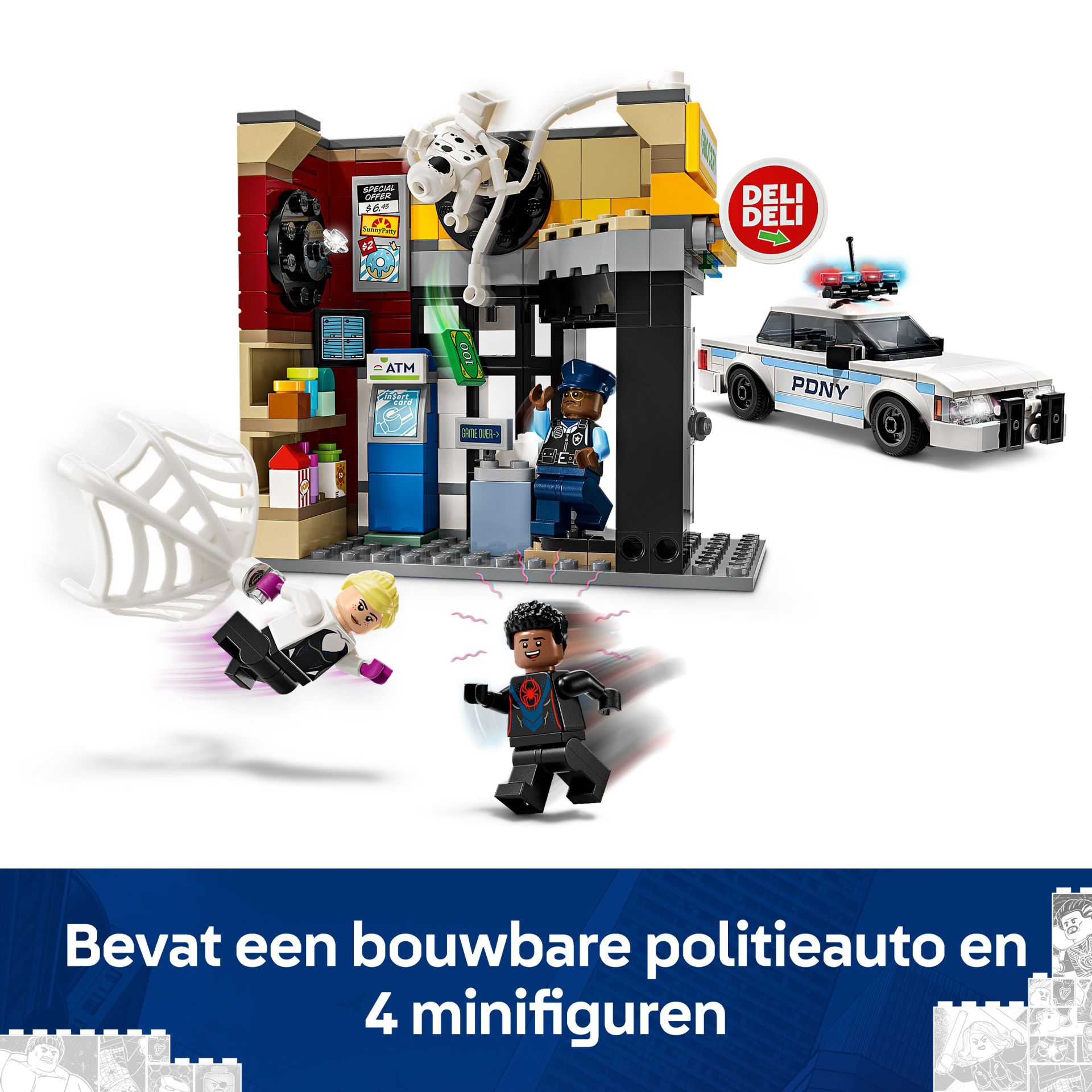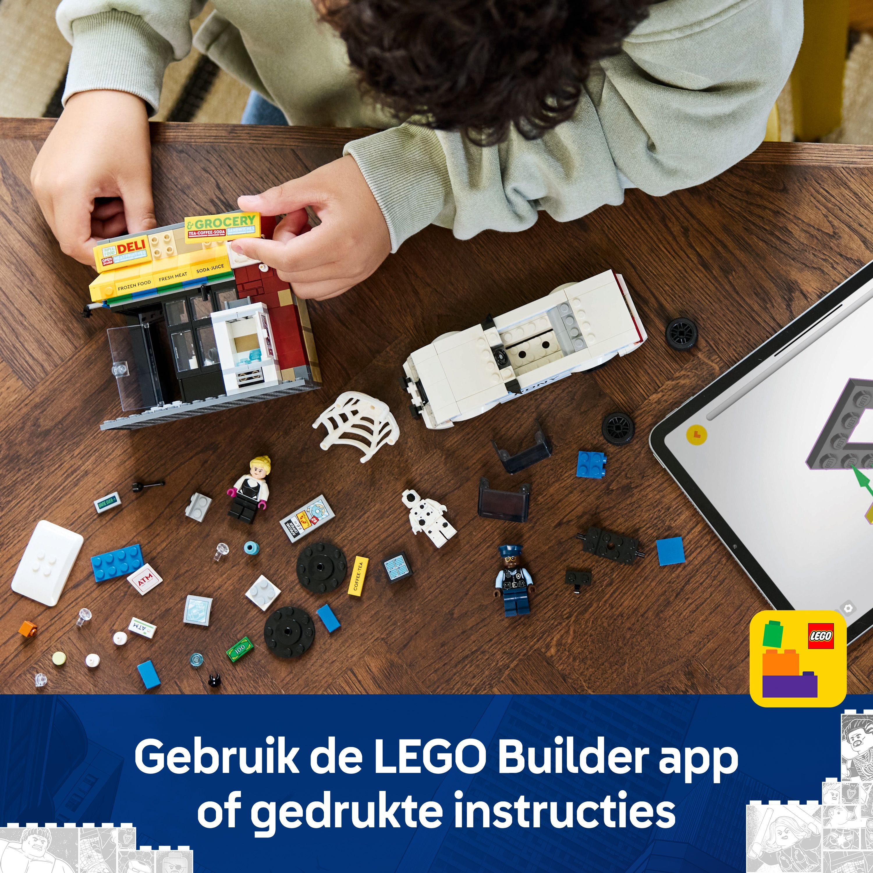 Deze Spider-Man speelgoedwinkel speelset is inclusief 4 minifiguren: Miles Morales, de Spot, Gwen Stacy en agent Jefferson. De supermarkt heeft een muur met explosiefunctie waarmee de geldautomaat kan worden verwijderd. Accessoires zijn onder andere een lang, flexibel webtouw en een flexibel web dat groot genoeg is om een minifiguur in te vangen. De speelgoed politieauto kan open en er kunnen 2 minifiguren in worden geplaatst.