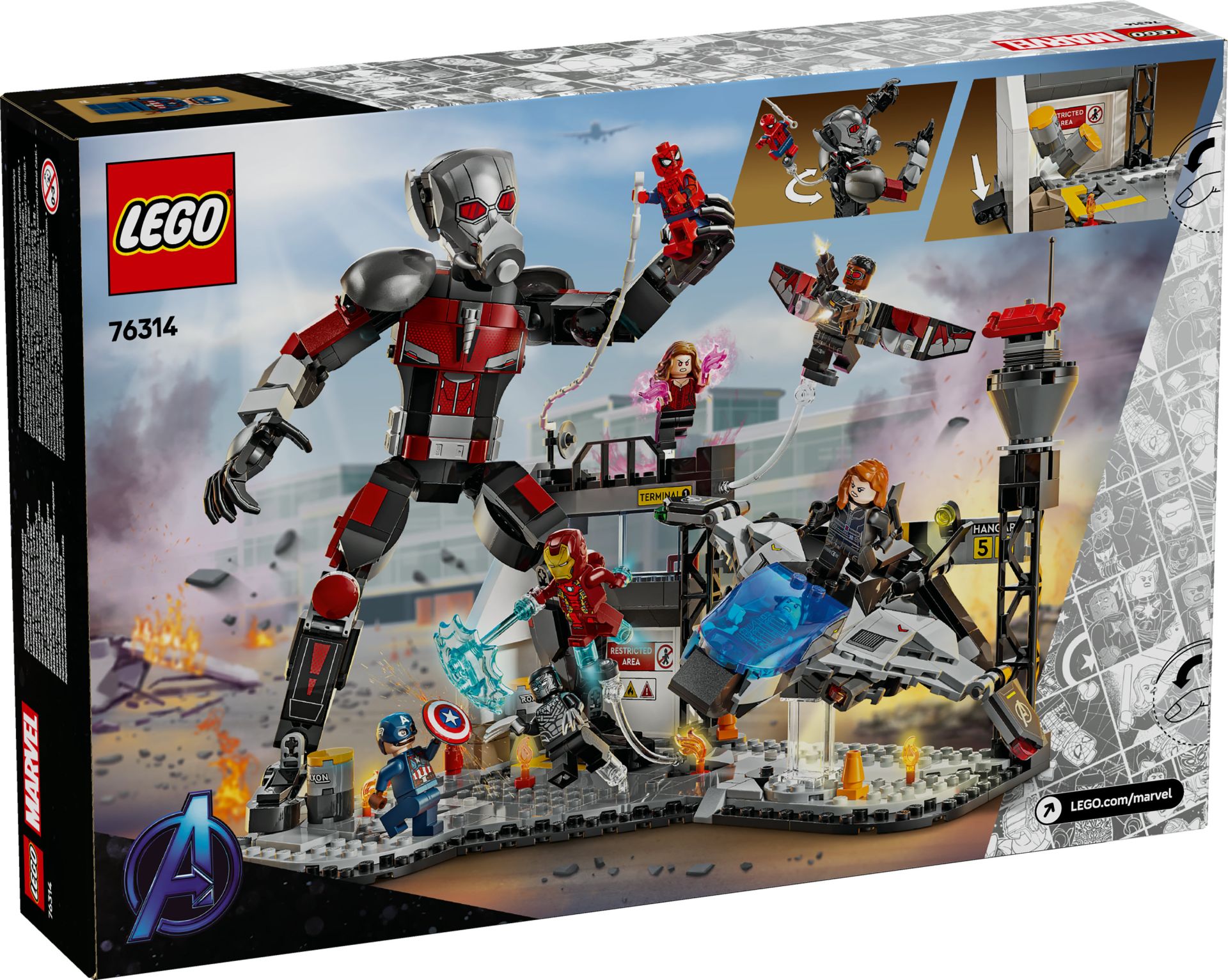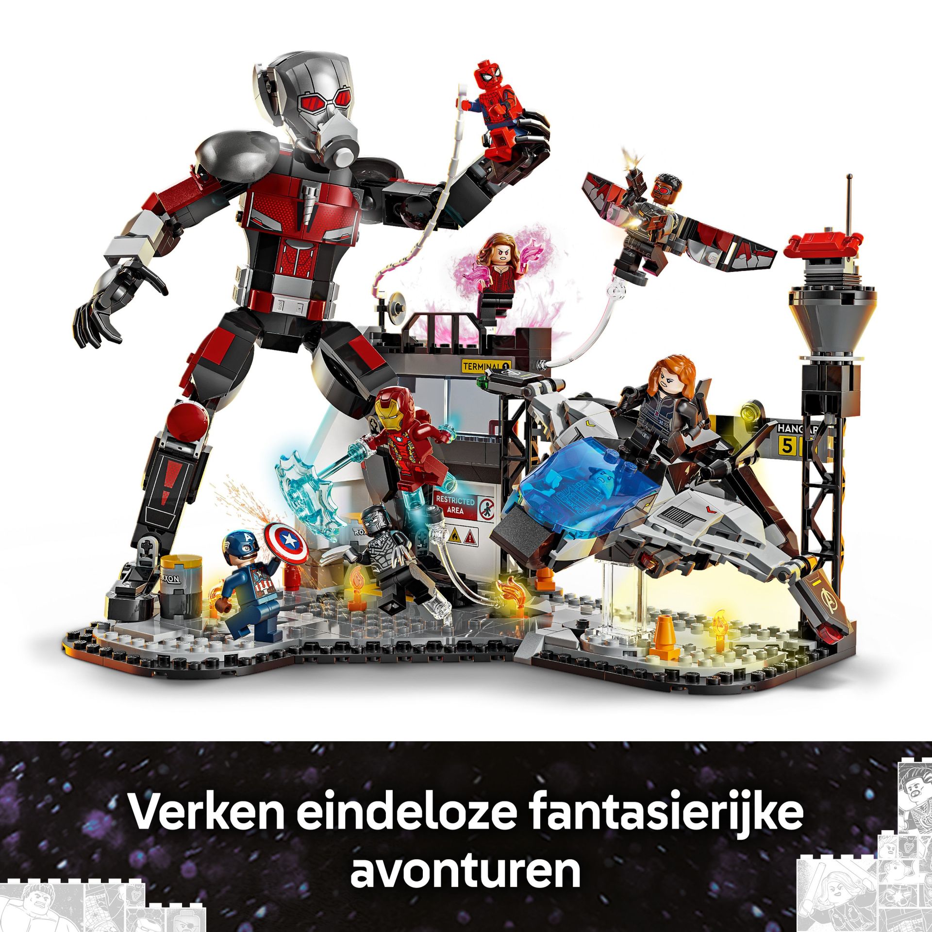 Deze bouwbare speelset is gebaseerd op de grootse strijd op het vliegveld uit de Marvel Studios film Captain America: Civil War. De set bevat 8 minifiguren: Captain America, Winter Soldier, Wanda, Falcon, Iron Man, Spider-Man, Black Widow en Black Panther met wapens en accessoires, plus een volledig verstelbare Ant-Man actiefiguur met een hoogte van ca. 24 cm. Het Quinjet vliegtuig heeft inklapbare vleugels en een cockpit met plaats voor een minifiguur. De actie wordt verder ondersteund door een vat met een explosiefunctie.