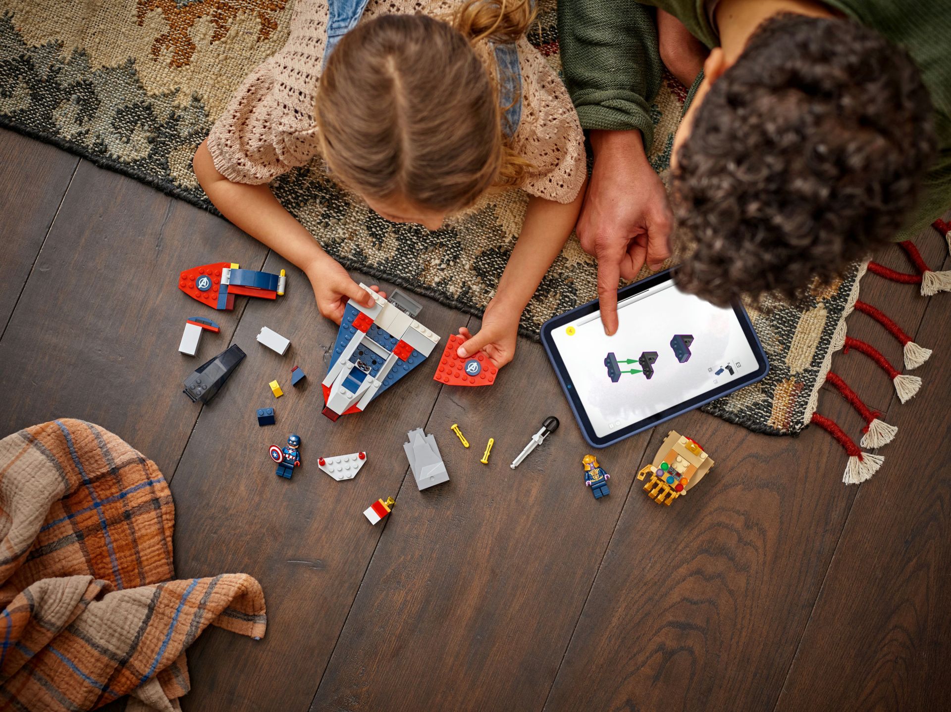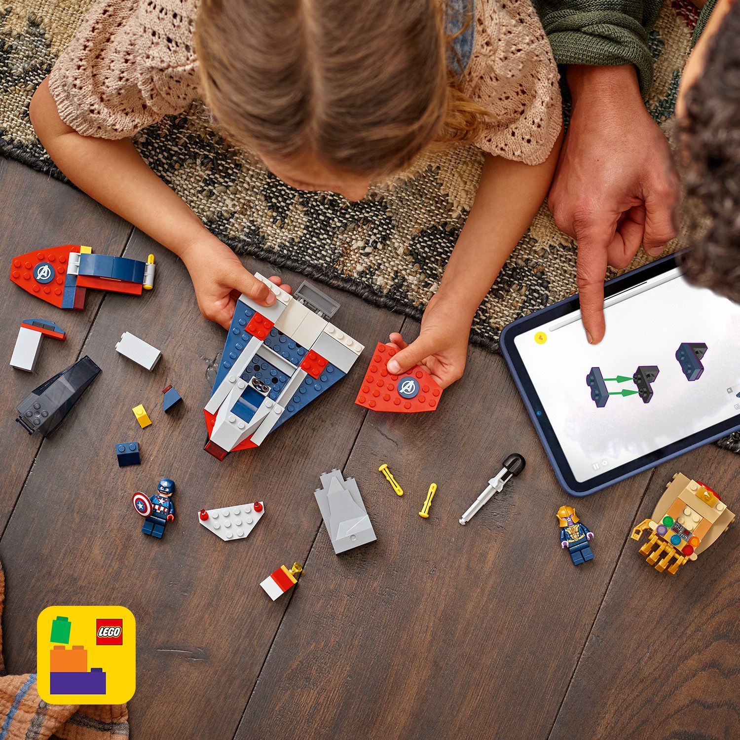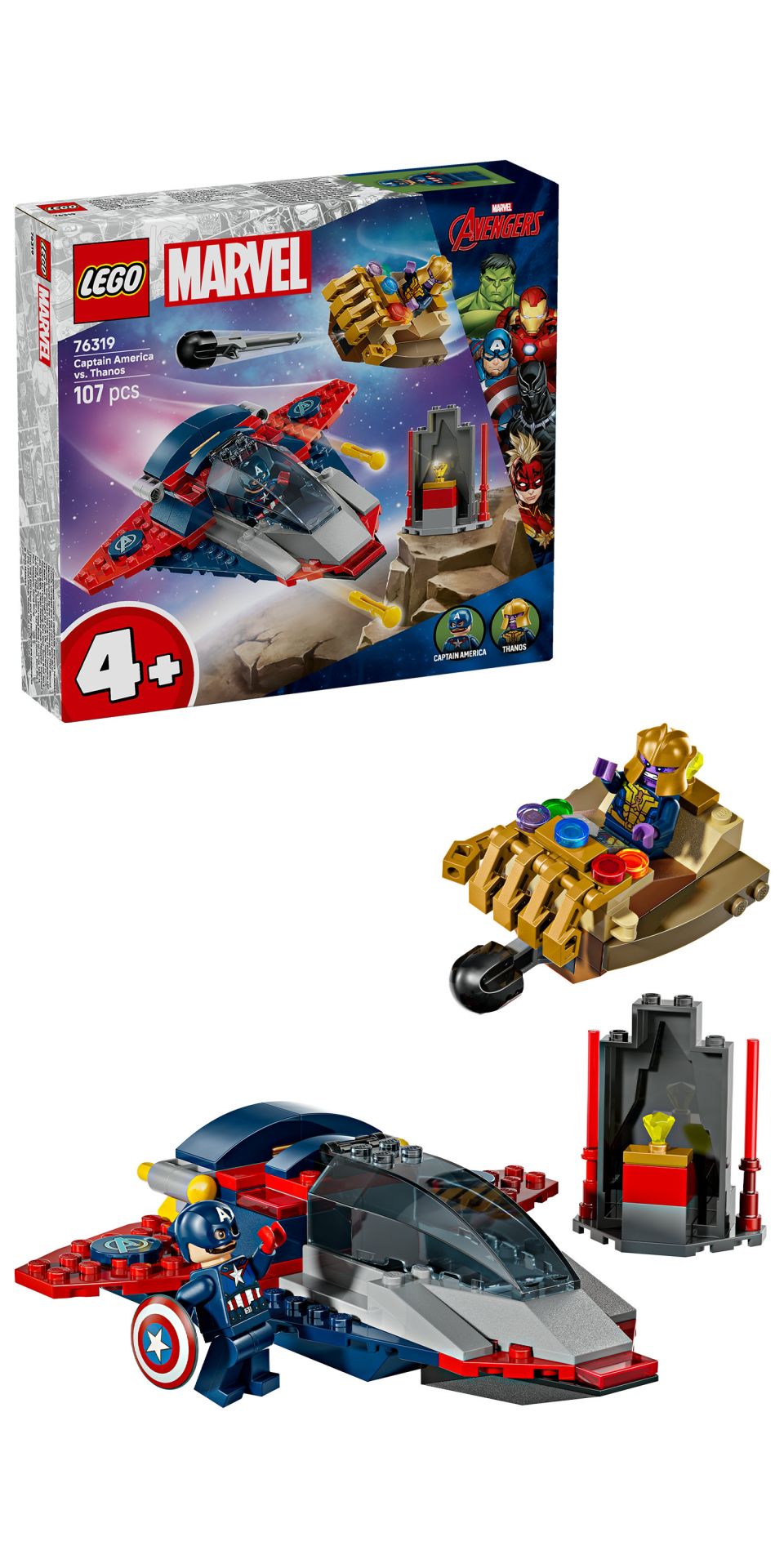 De bouwset bevat 2 minifiguren: Thanos in een ruimteschip dat op de Infinity Gauntlet lijkt met beweegbare 'vingers' en een schieter en Captain America in een Quinjet met 2 schieters, een cockpit die open kan en een verborgen vak voor zijn schild. Een klein model met een kostbare steen inspireert creatieve verhalen waarin Captain America probeert te voorkomen dat Thanos de edelsteen steelt. Elk zakje stenen in de doos bevat een grote startsteen voor een eenvoudig te bouwen model en een personage, zodat het spelen snel kan beginnen. Inclusief een boekje met intuïtieve instructies. De set bevat 107 onderdelen.