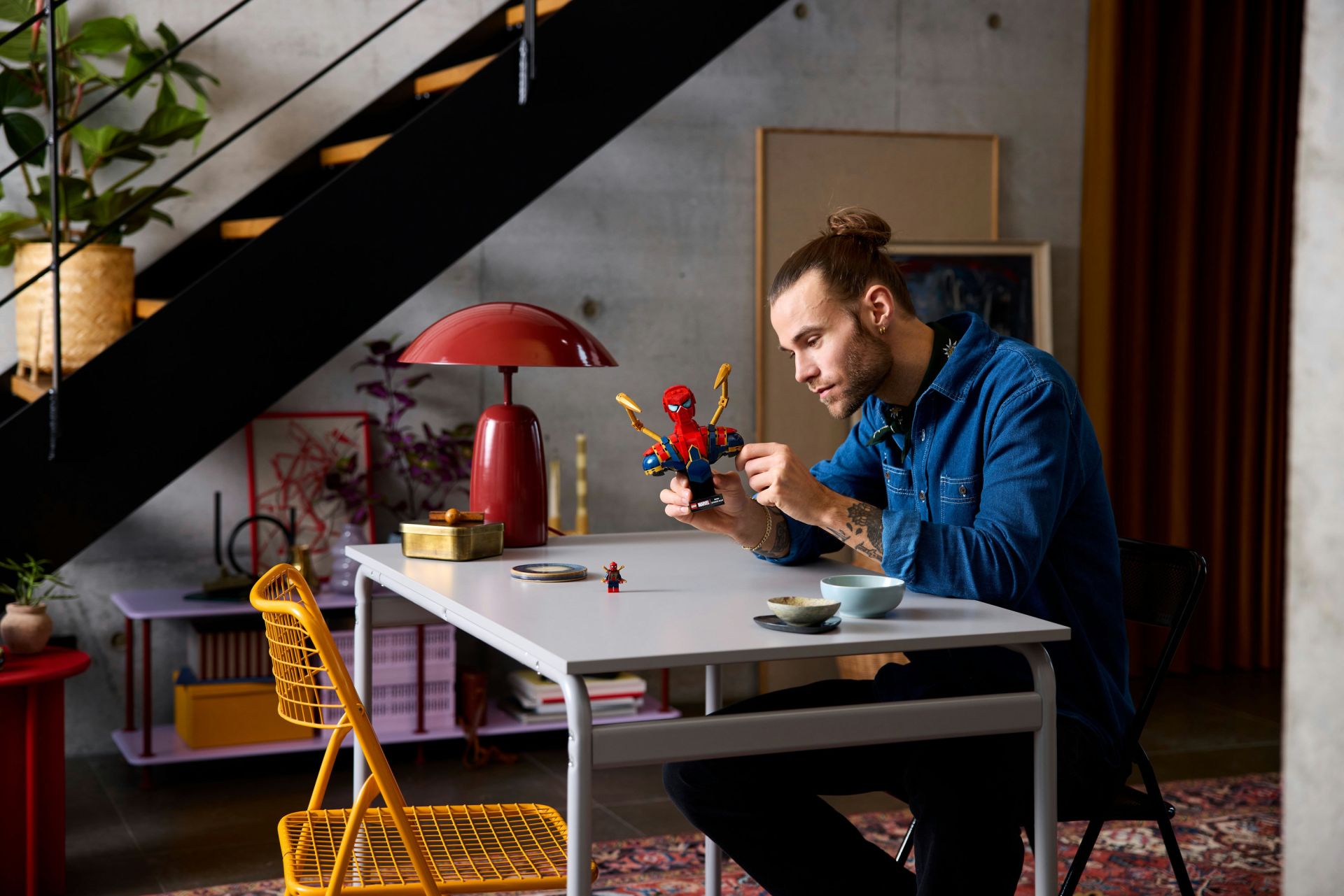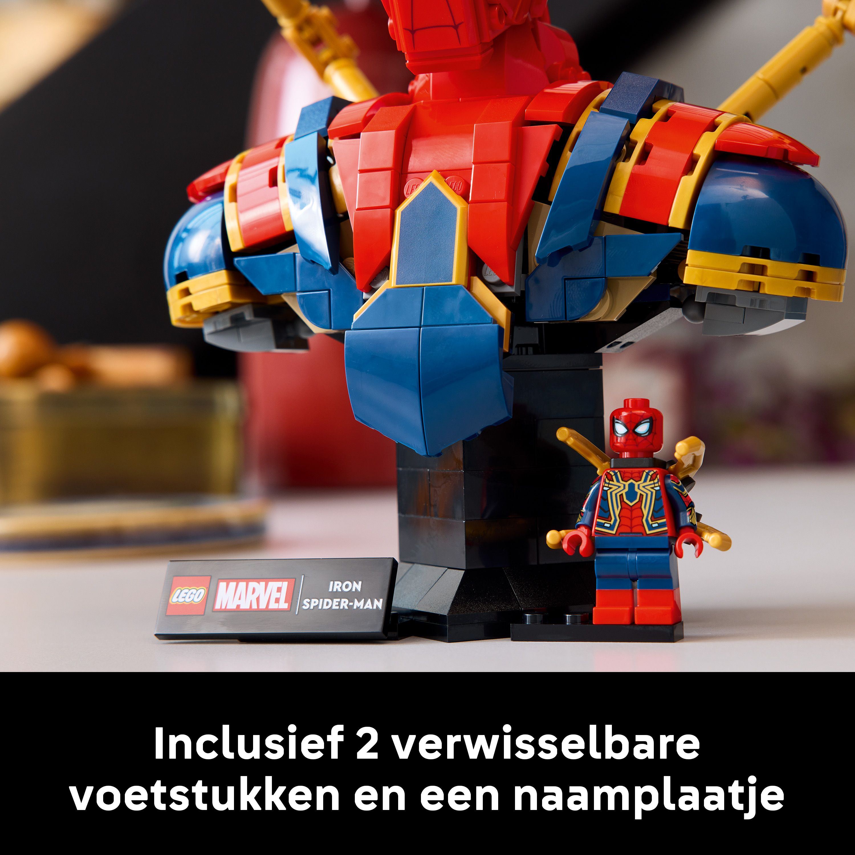 Dit opvallende bouwmodel heeft 2 beweegbare mechanische armen en een draaibaar hoofd. De set wordt geleverd met 2 verwisselbare voetstukken met een naamplaatje: één met ruimte voor de afneembare Iron Spider-Man minifiguur en één zonder. De boeiende bouwervaring wordt nog leuker met een digitale versie van de bouwinstructies van de set, die je kunt vinden in de LEGO Builder app.
