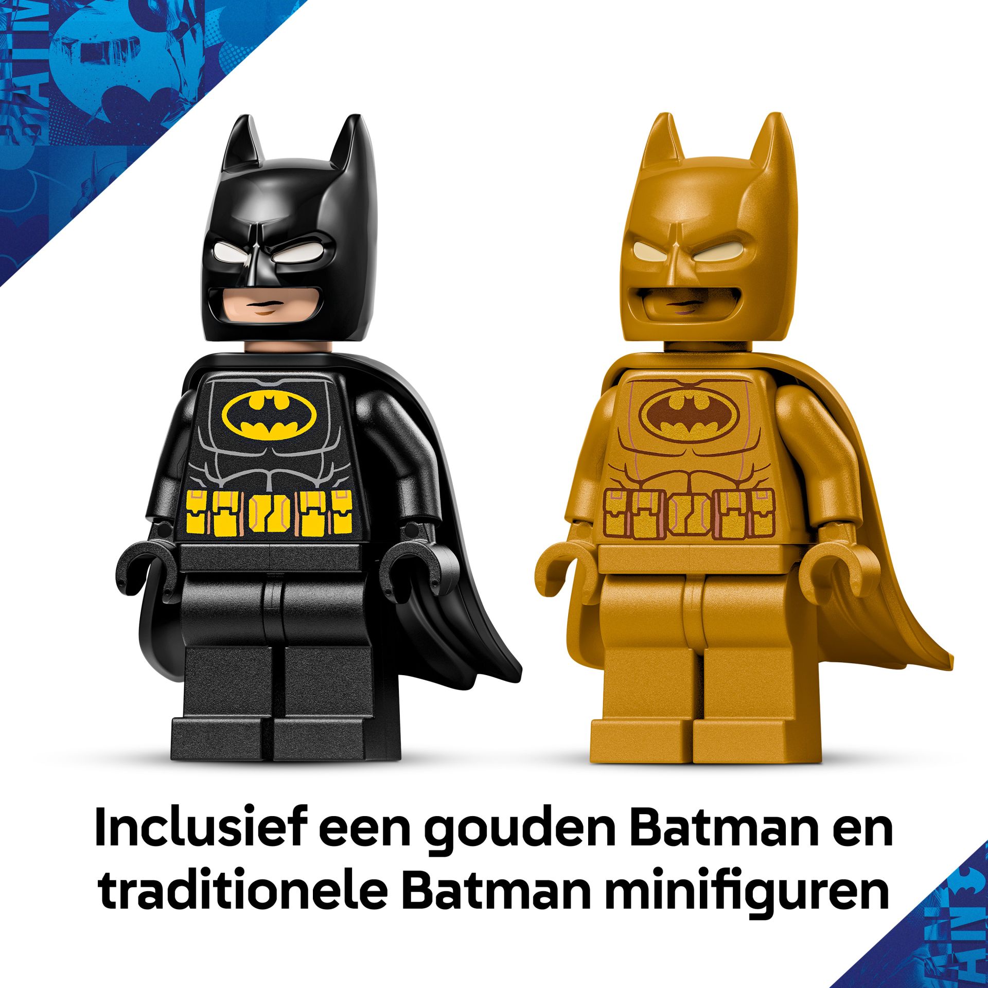 2 BATMAN MINIFIGUREN – inclusief een goudkleurige Batman minifiguur, een goudkleurige jubileummunt en een klassieke Batman minifiguur die in een luikje in het midden van het model past