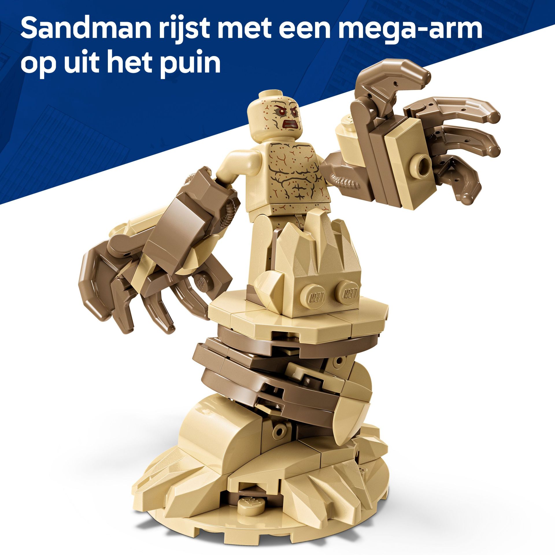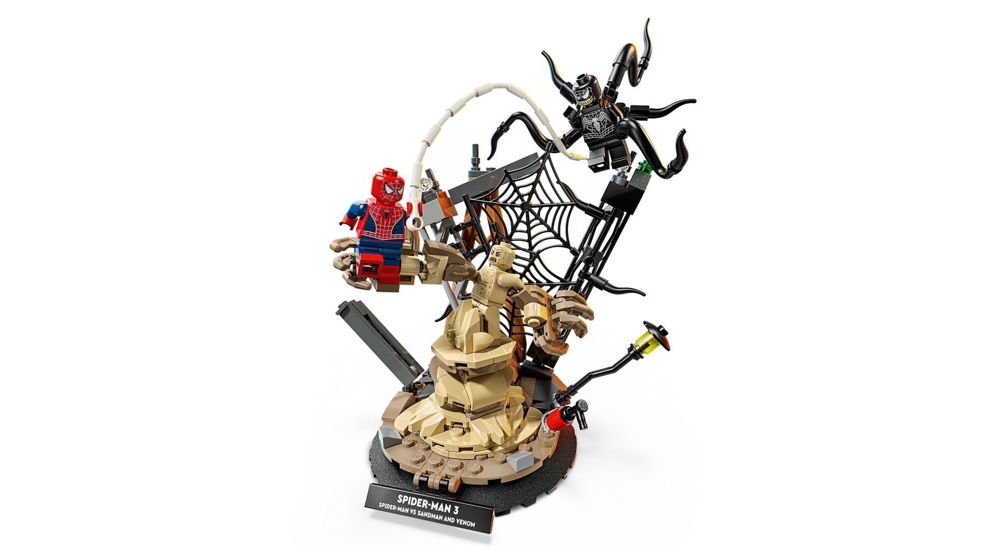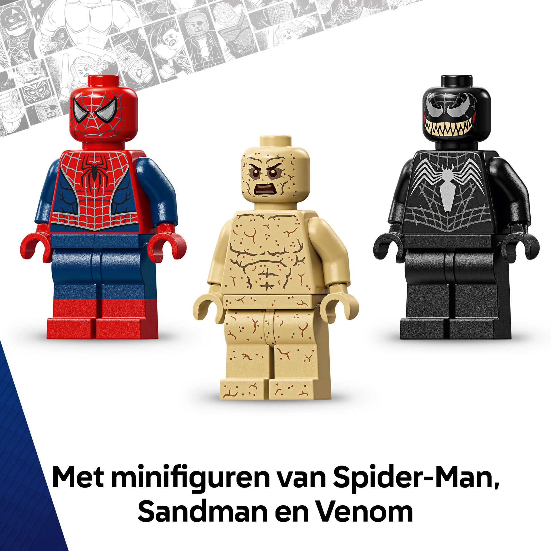 3 LEGO Marvel MINIFIGUREN – deze set bevat 3 minifiguren die de strijd met elkaar aangaan op een bouwplaats: Spider-Man, Venom met tentakels en Sandman met een bouwbare basis en een supergrote arm