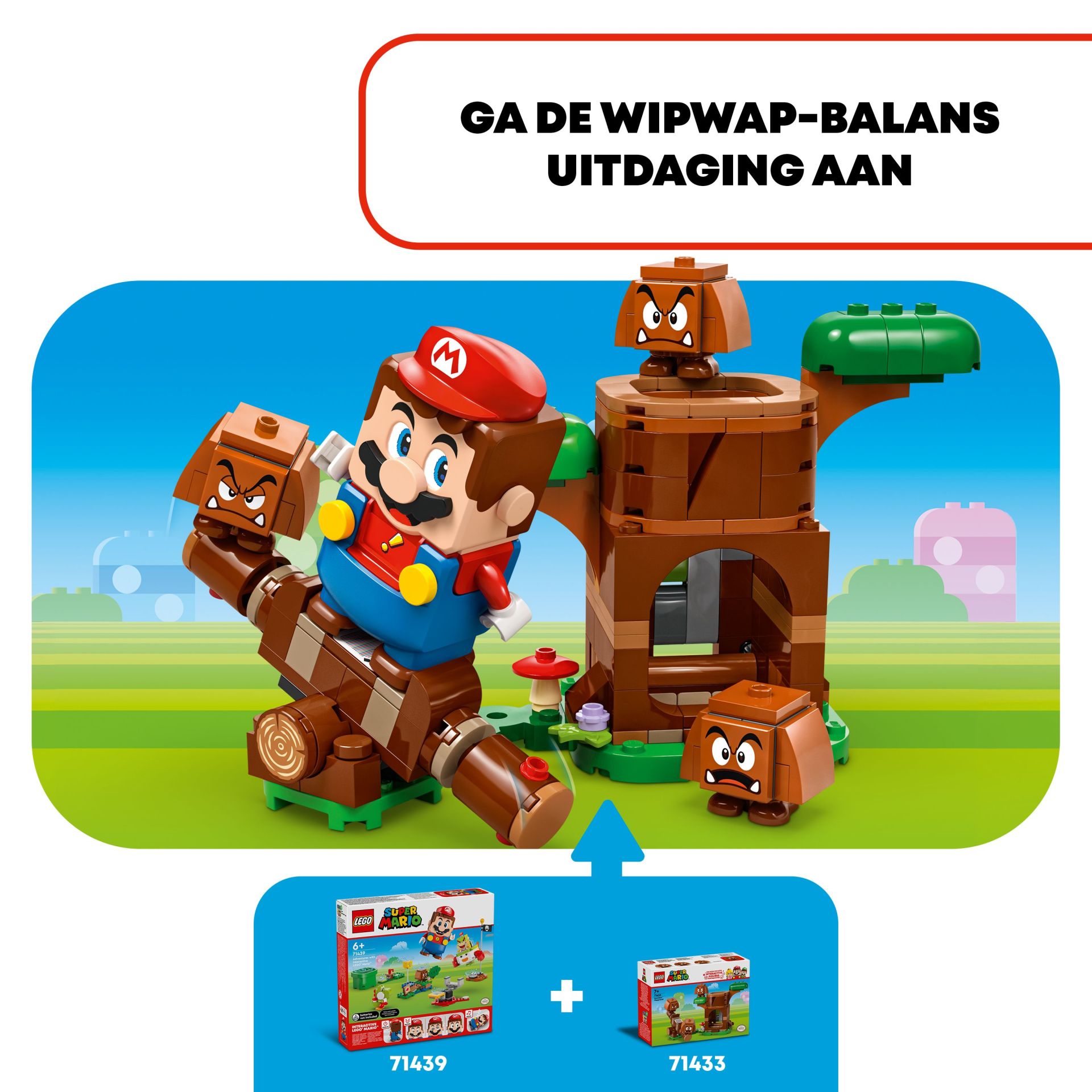 Avontuurlijk LEGO® speelgoed – druk op de hendel aan de achterkant van de bouwbare boomstam om een Goomba tevoorschijn te laten springen of speel met de Goomba's op de wipwap