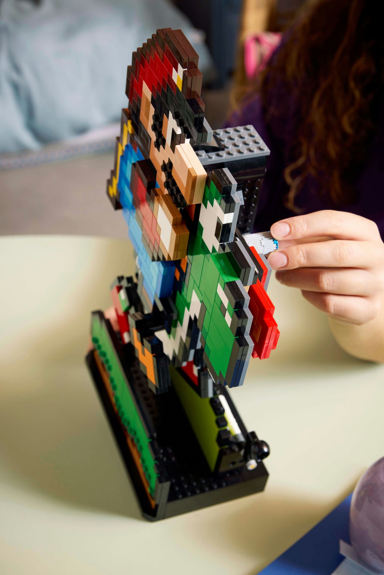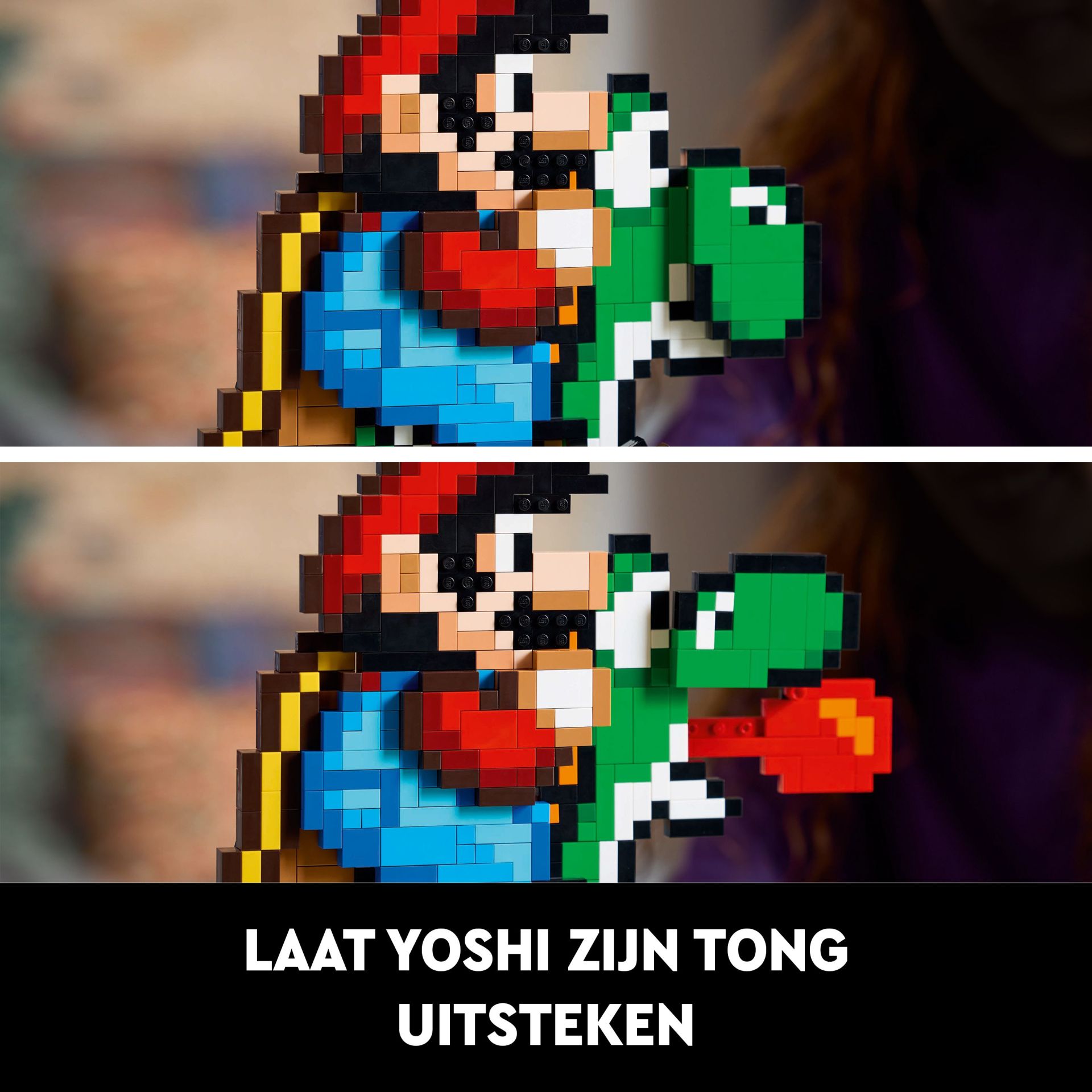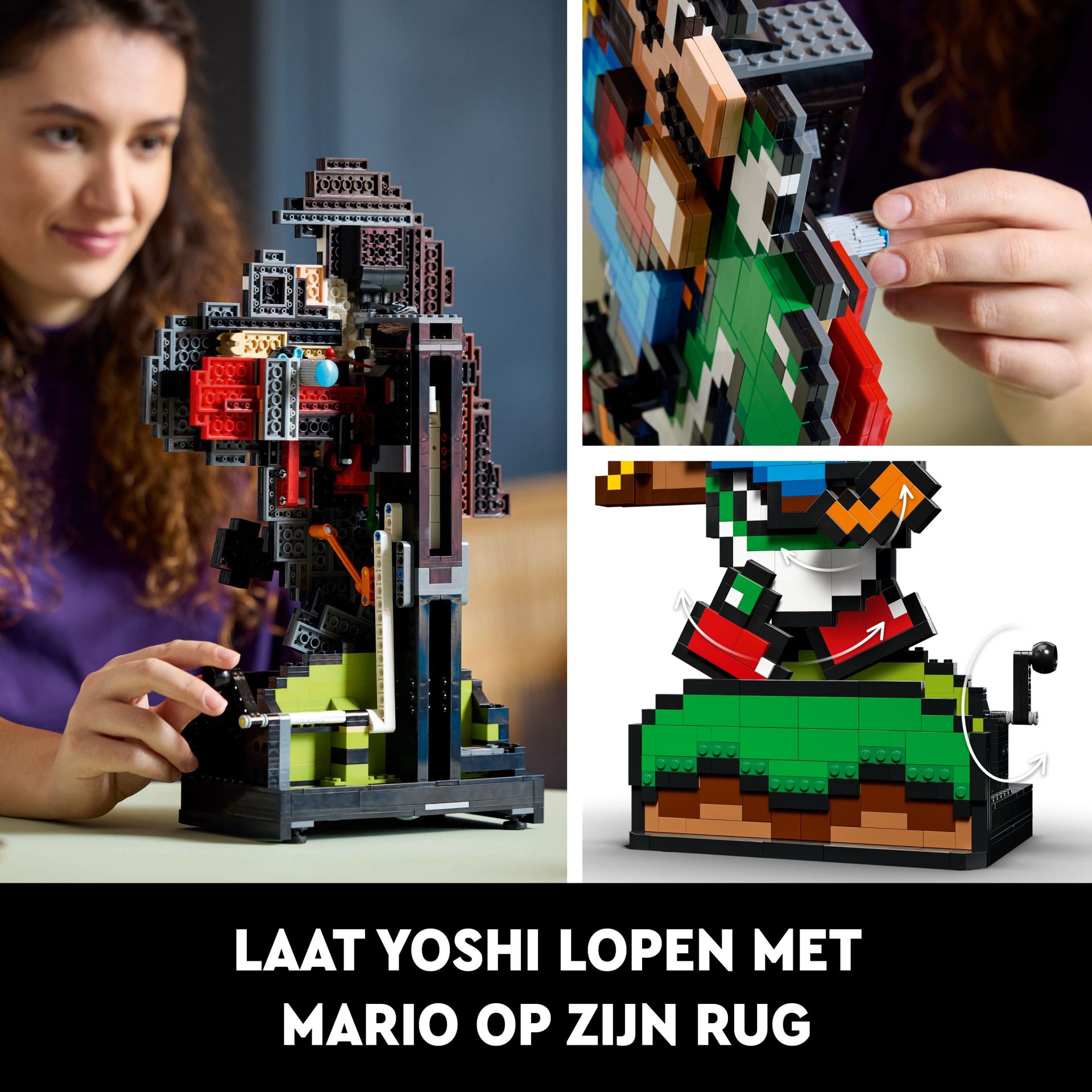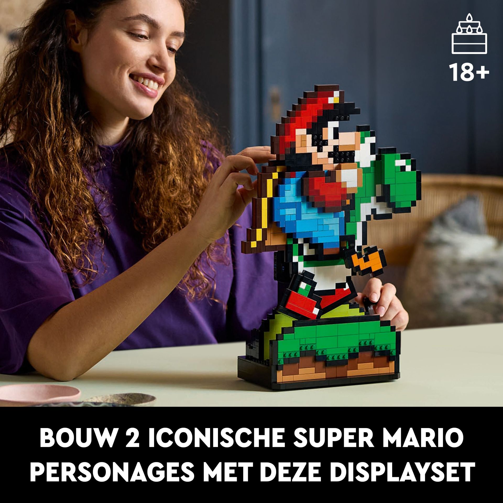 Bouw een stukje nostalgie naar de vroege generatie Super Mario™ spellen met dit speelse Super Mario World™: Mario en Yoshi displaymodel. Deze Nintendo® verzamelset is een leuk LEGO® Super Mario™ cadeau voor volwassen fans en bevat gepixelde Mario en Yoshi figuren om neer te zetten in huis of op kantoor. Draai aan de hendel om Yoshi te laten rennen met Mario op zijn rug en gebruik de draaiknop om te zien hoe Yoshi zijn tong uitsteekt.