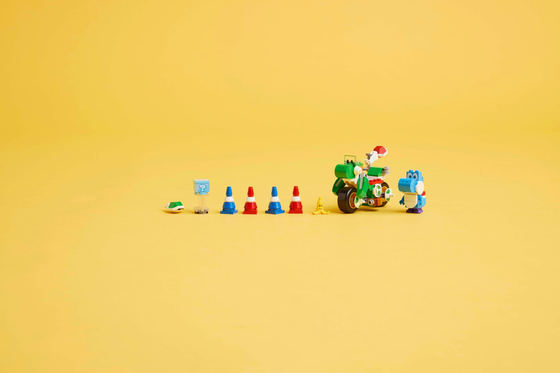 - Interactief speelplezier – rijd op de Yoshi-crosser met LEGO Mario, LEGO Luigi of LEGO Peach (figuren niet inbegrepen) om Mario Kart geluiden en visuele effecten te activeren en digitale items uit de voorwerpkist te halen