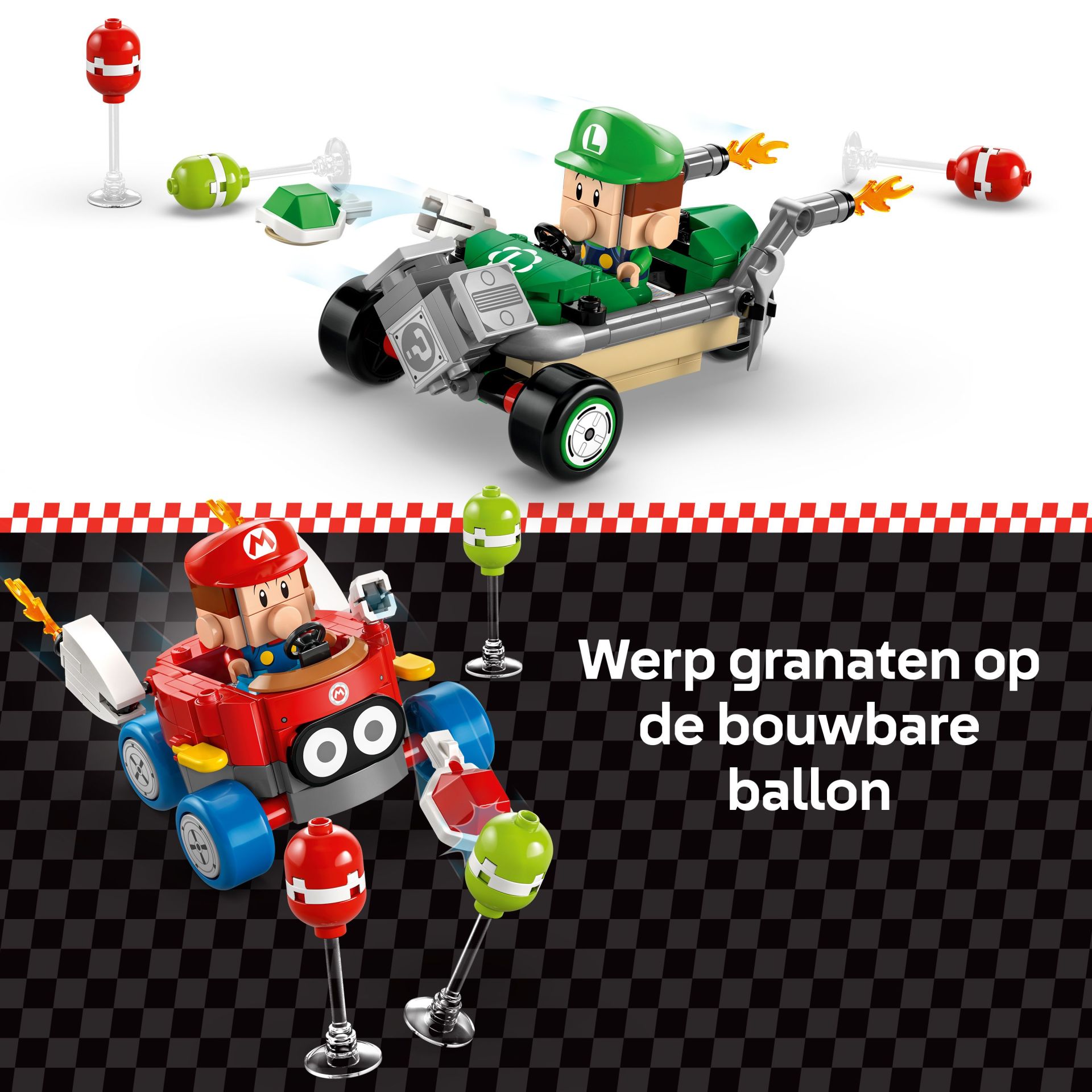 - Mario Kart voertuigen – zet Baby Mario in zijn Biddybuggy en Baby Luigi in zijn Driebander en lanceer schilden om de ballonnen omver te gooien