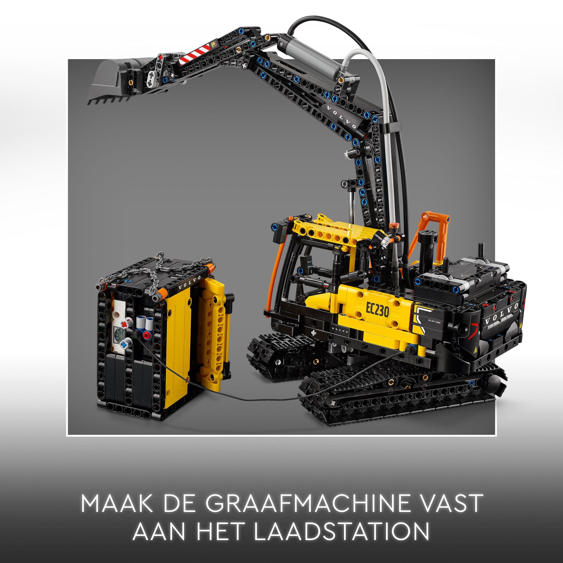 Elektrisch 'oplaadstation' – kinderen die dol zijn op speelgoed voertuigen kunnen het laadstation met behulp van de schop en kettingen optillen en laten zakken, klaar om het aan de elektrische graafmachine te bevestigen