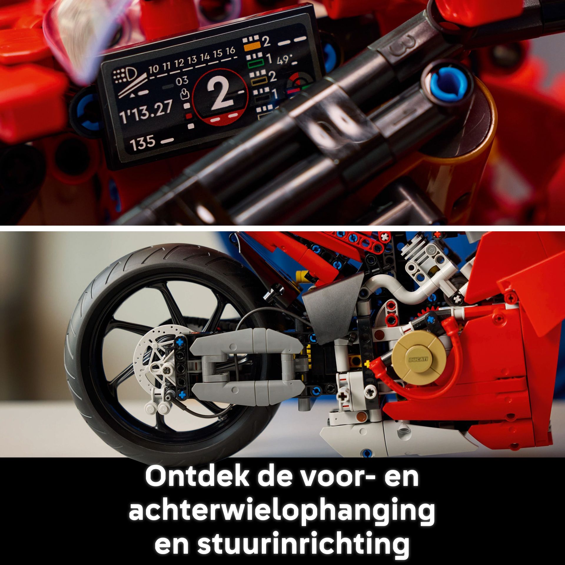 LEGO Technic Ducati Panigale V4 S motor – het LEGO motor model zit boordevol indrukwekkende details en authentieke kenmerken, zoals de voor- en achterwielophanging en stuurinrichting