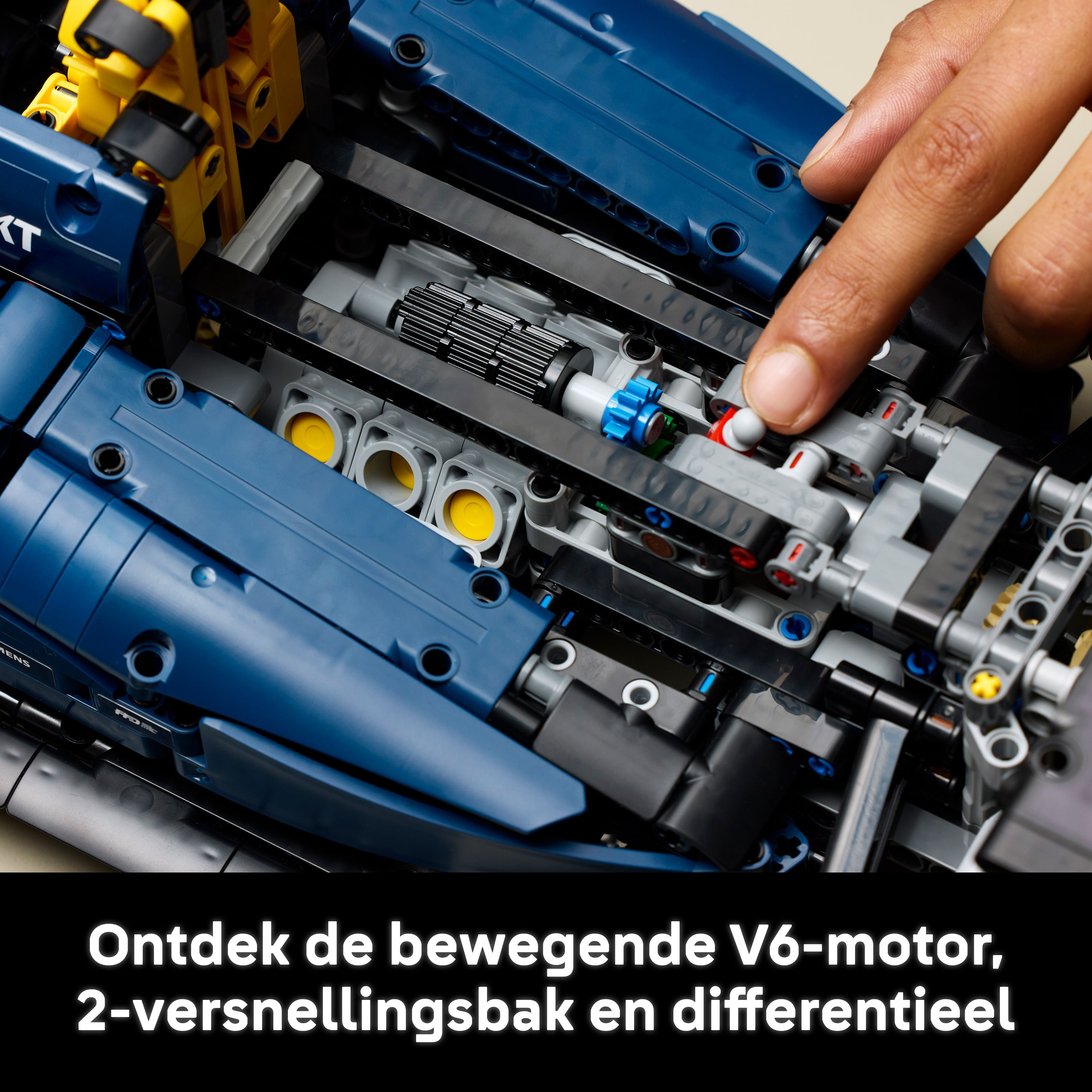 LEGO auto met realistische motor en versnellingsbak – bekijk de versnellingsbak met 2 versnellingen en het differentieel en verwijder de motorkap om de V6-motor met bewegende zuigers te bewonderen