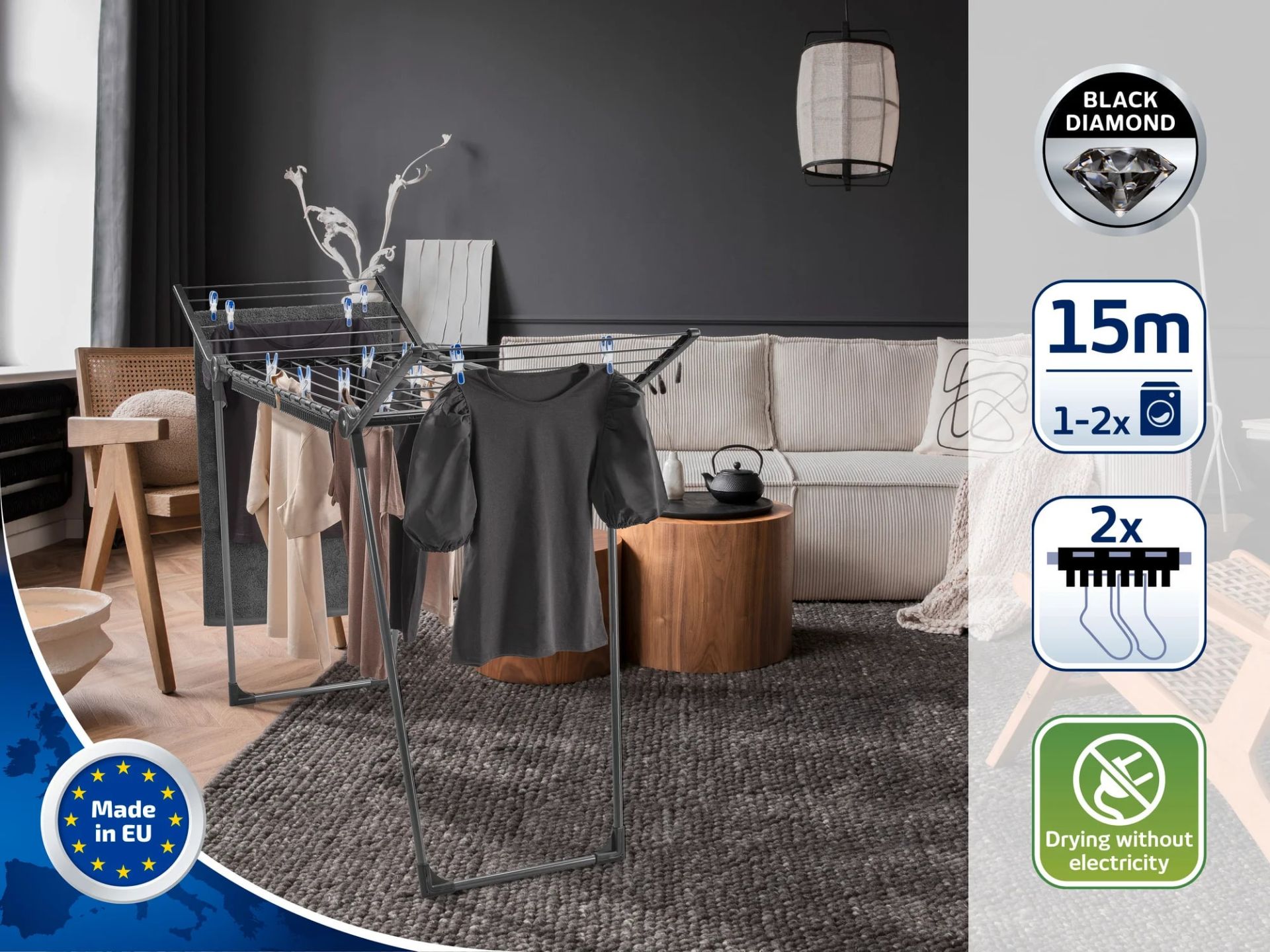 Leifheit Droogrek Pegasus 150 Solid Slim Black - 15m - 55x157x87 cm - Klapvleugels - met 2 Houders voor Klein Wasgoed